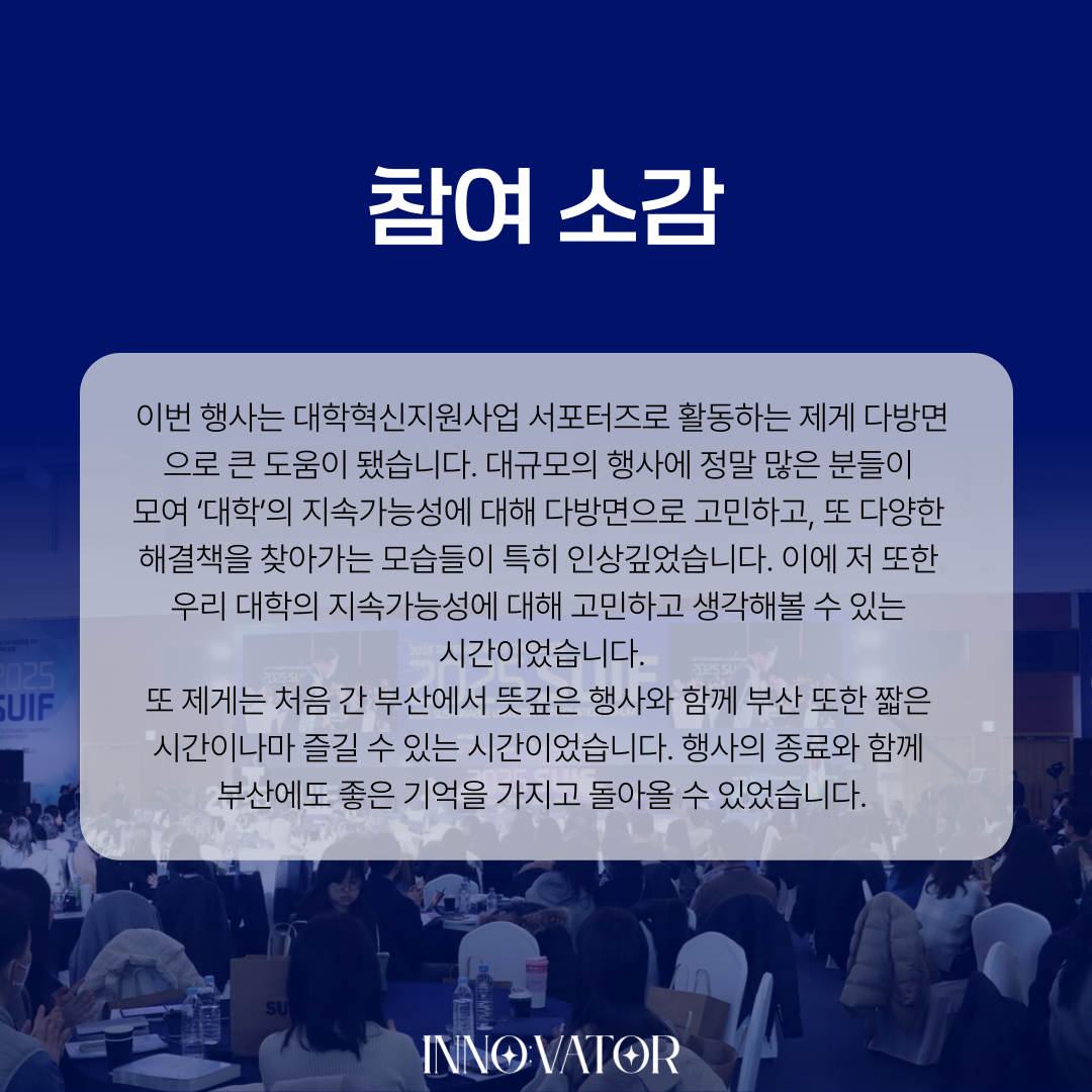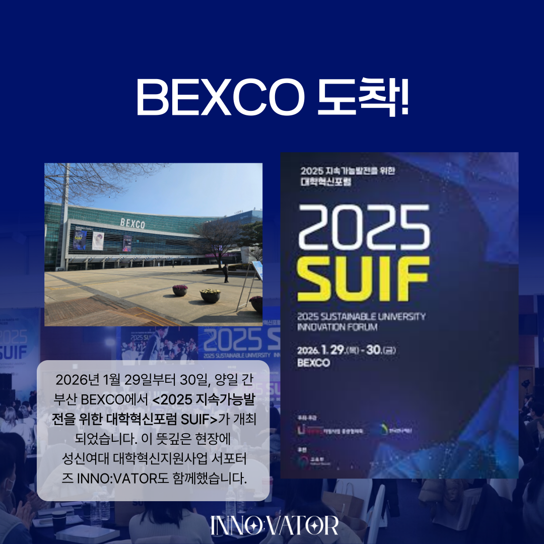2026년 1월 29일부터 30일, 양일 간 부산 BEXCO에서 <2025 지속가능발전을 위한 대학혁신포럼 SUIF>가 개최되었습니다. 이 날 행사는 대학혁신지원사업 총괄협의회 및 한국연구재단의 주최 및 주관, 교육부의 후원으로 진행되었습니다. 이 뜻깊은 현장에 성신여대 대학혁신지원사업 서포터즈 INNO:VATOR도 함께했습니다.