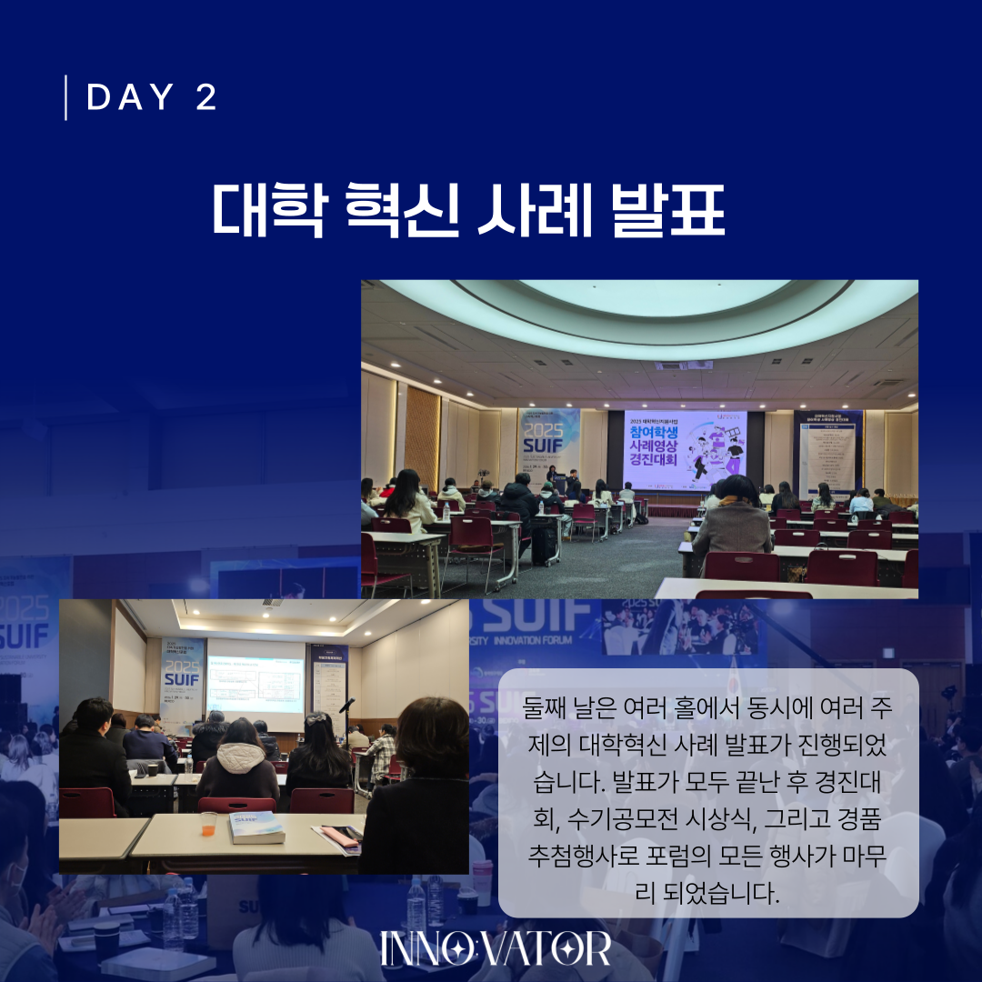 둘째 날 행사는 여러 홀에서 동시에 여러 주제의 대학혁신 사례 발표가 진행되었고, 타임라인에 따라 직접 원하는 주제의 발표들을 들을 수 있었습니다. 저는 한 강의실에서 이어지는 발표들을 계속 들었고, 유현주 인하대 전공디자인센터 연구교수님의 ‘데이터를 활용한 학생주도 전공설계 지원 전략: 인하대학교 전공디자인센터의 운영사례’ 발표가 인상깊었습니다. 학생주도의 전공설계를 데이터를 활용하는 방식으로 운영하는 것이 제게는 굉장히 새롭게 다가와, 가장 집중했던 시간이었습니다. 발표가 모두 끝나고 메인 행사장에서 경진대회, 수기공모전 시상식, 그리고 둘째 날도 진행된 경품 추첨행사와 함께 <2025 지속가능발전을 위한 대학혁신포럼>이 모두 마무리되었습니다.