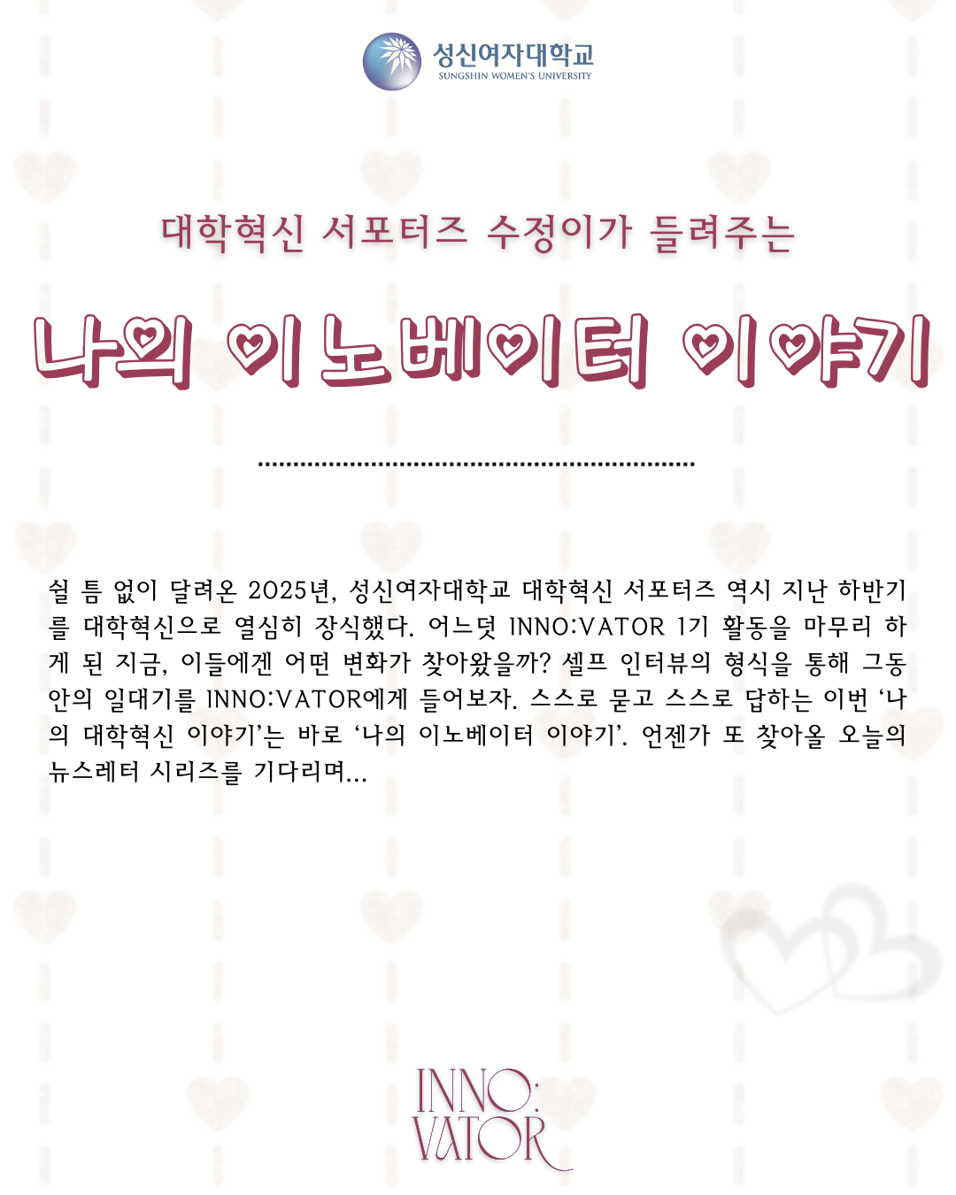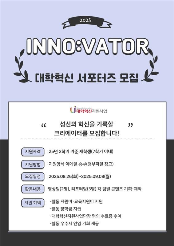 짧지만 밀도 있었던 여정을 마친 INNO:VATOR 1기. 기획하고, 기록하고, 연결하는 과정 속에서 축적된 작은 시도들은 곧 대학혁신의 의미 있는 발자취가 된다. INNO:VATOR의 첫 기수는 막을 내렸지만, 2기와 3기, 그 뒤 이어질 수많은 이야기들이 앞으로의 여정을 이끌 것이라 기대한다. 우리는 학생의 시선으로 성신여자대학교의 혁신을 기록하며, 더 나은 교육 환경을 만들어가는 현장에 함께할 것이다.