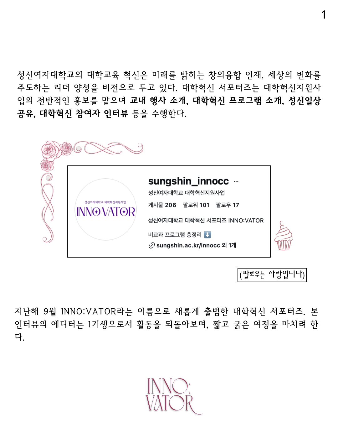 지난해 9월 INNO:VATOR라는 이름으로 새롭게 출범한 대학혁신 서포터즈. 본 셀프인터뷰에서 에디터는 1기생으로서 활동을 되돌아보며 짧고 굵은 여정을 마치려 한다.