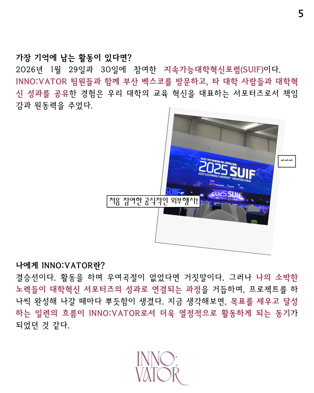 A. “지난 1월 29일과 30일에 참여한 지속가능대학혁신포럼(SULF)입니다. 팀원들과 함께 부산 벡스코를 방문하여 타 대학 관계자들과 INNO:VATOR의 대학혁신 성과를 공유한 경험은 매우 인상 깊었습니다. 이 경험을 통해 우리 대학에서도 학생의 시선과 아이디어가 더욱 적극적으로 반영된 혁신을 만들어가야 한다는 책임감과 동기를 얻게 되었습니다.”