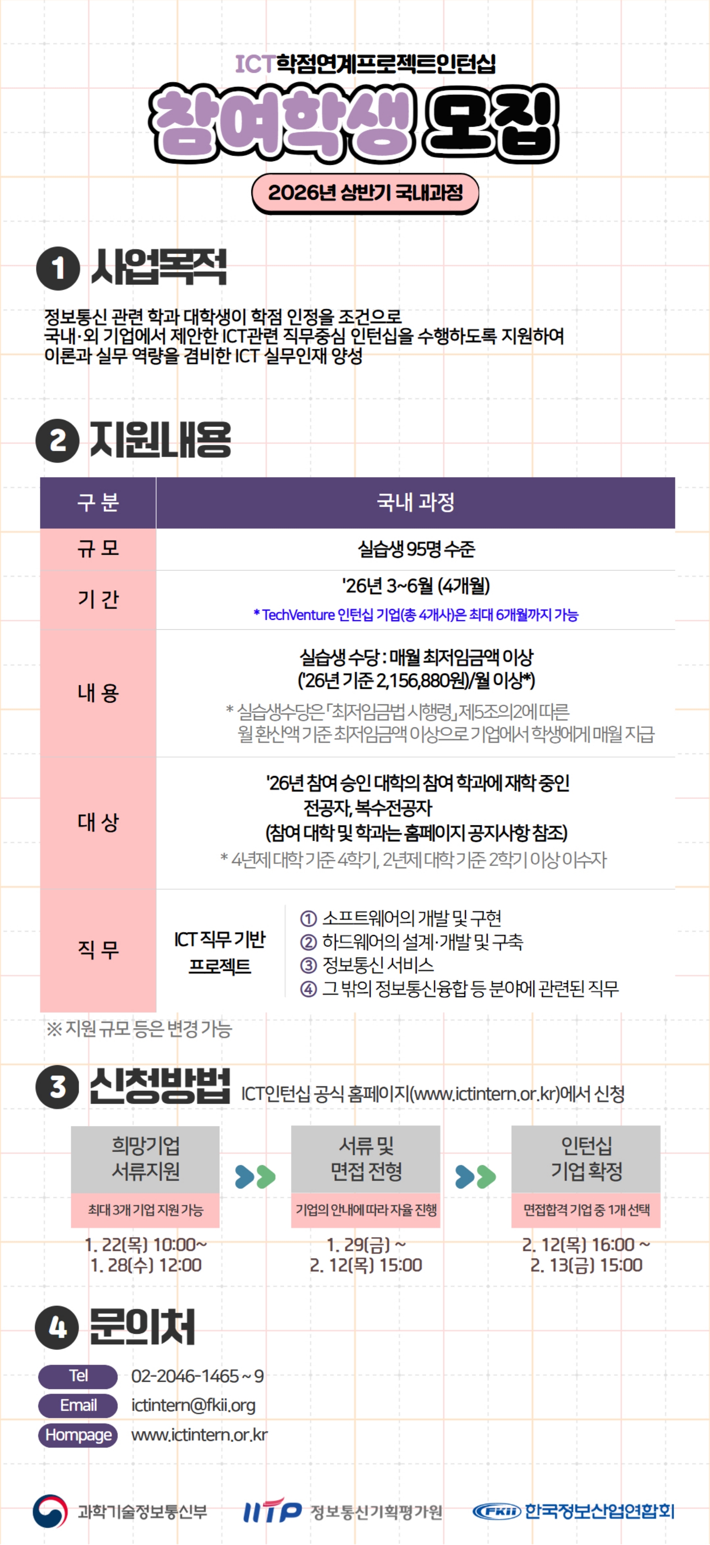 [현장실습운영팀] 2026년도 상반기 ICT 학점연계 프로젝트 인턴십(국내과정) 지원안내
