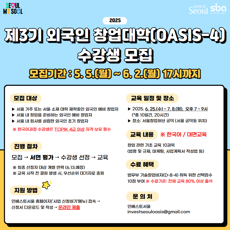 - 서울 거주 또는 서울 소재 대학에 재학 중인 외국인 예비 창업자