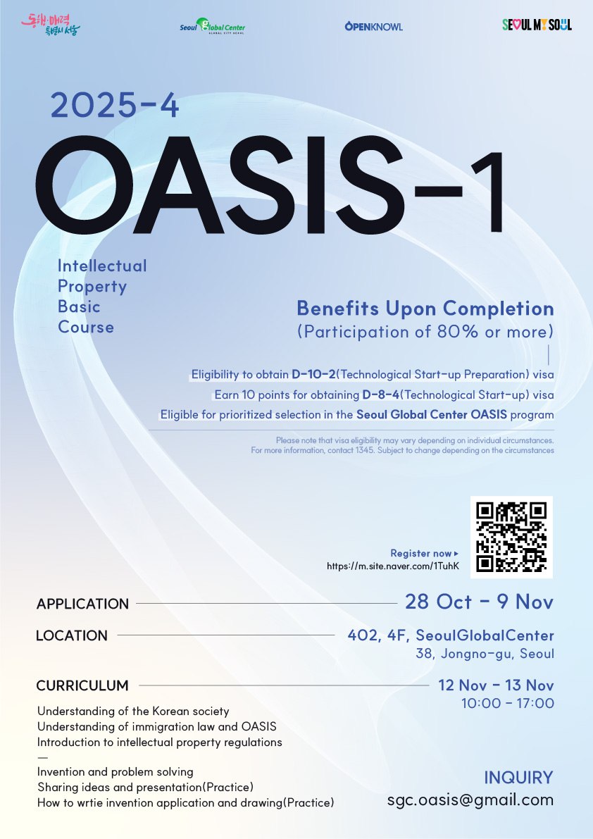 - Eligibility : Foreign (pre)entrepreneurs who want to start a technology business in Korea & Those who completed OASIS-1