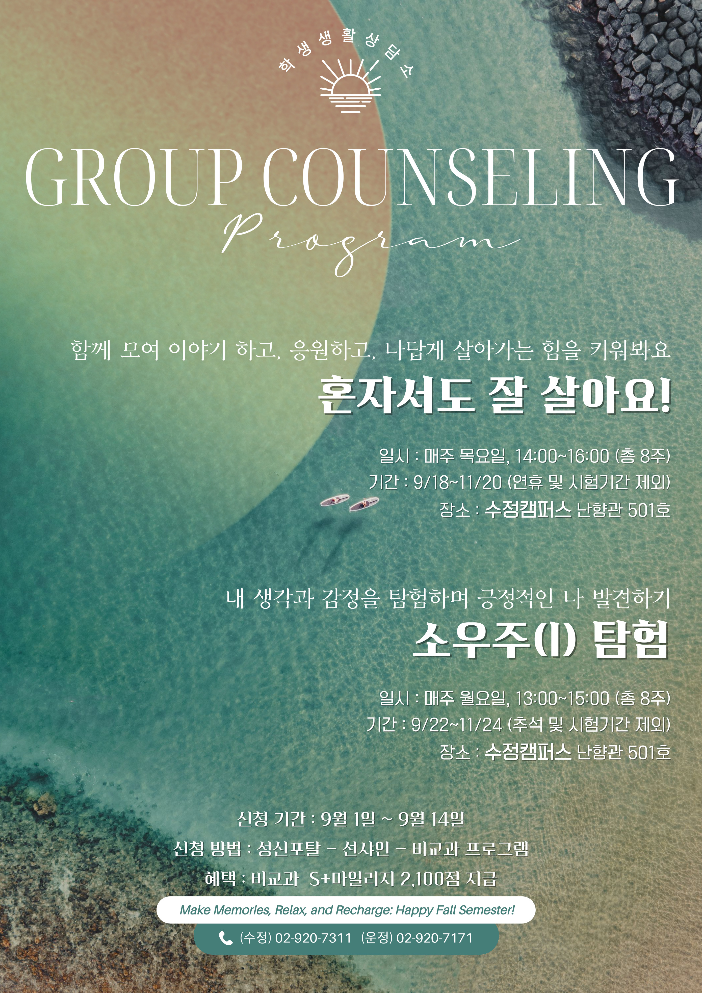 안녕하세요, 학생생활상담소에서는 2025학년도 2학기 집단상담 참여자를 모집합니다.