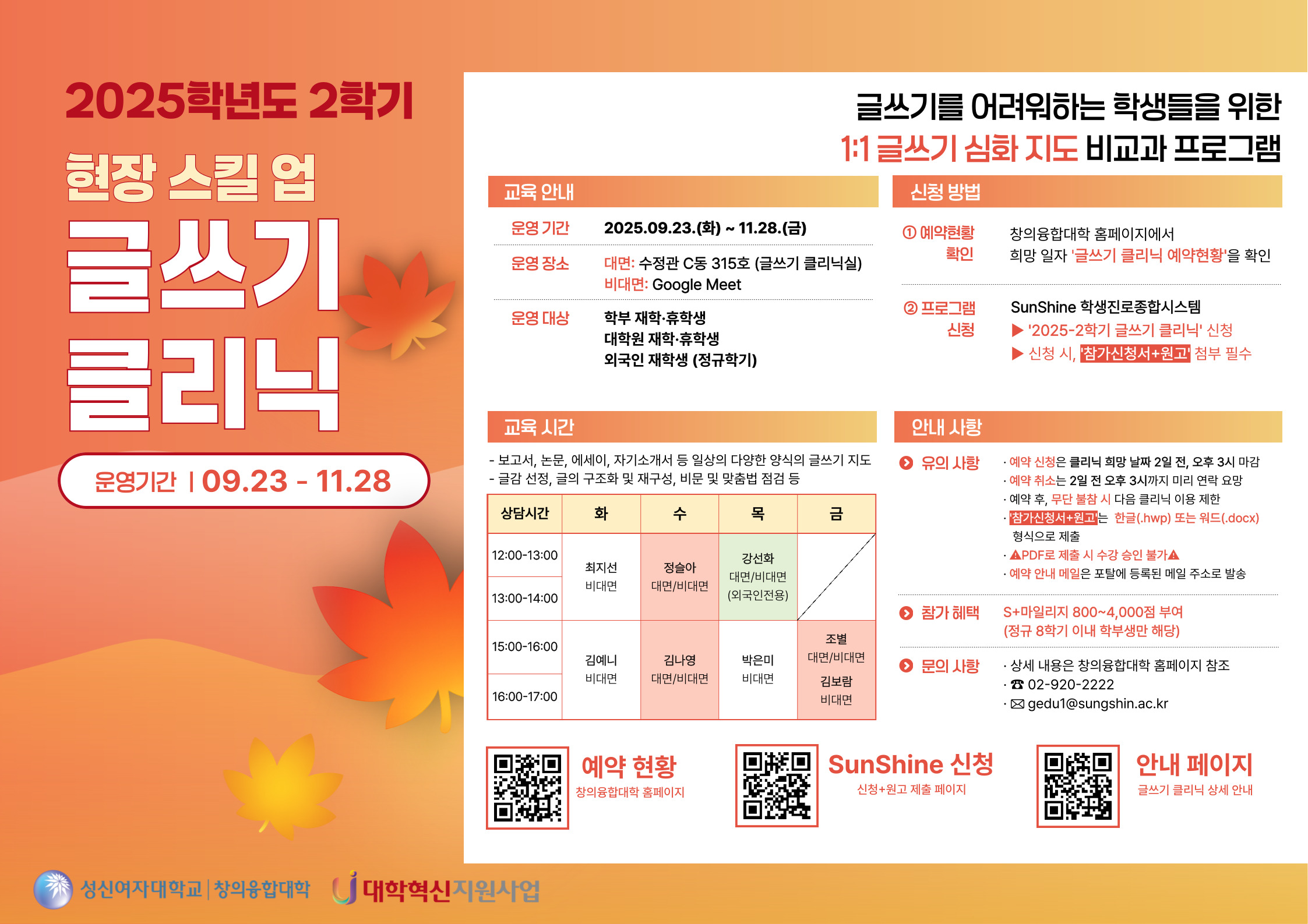 ② SunShine 학생진로종합시스템 ‘2025-2학기 글쓰기 클리닉‘→ ‘참가신청서+원고’ 첨부하여 신청