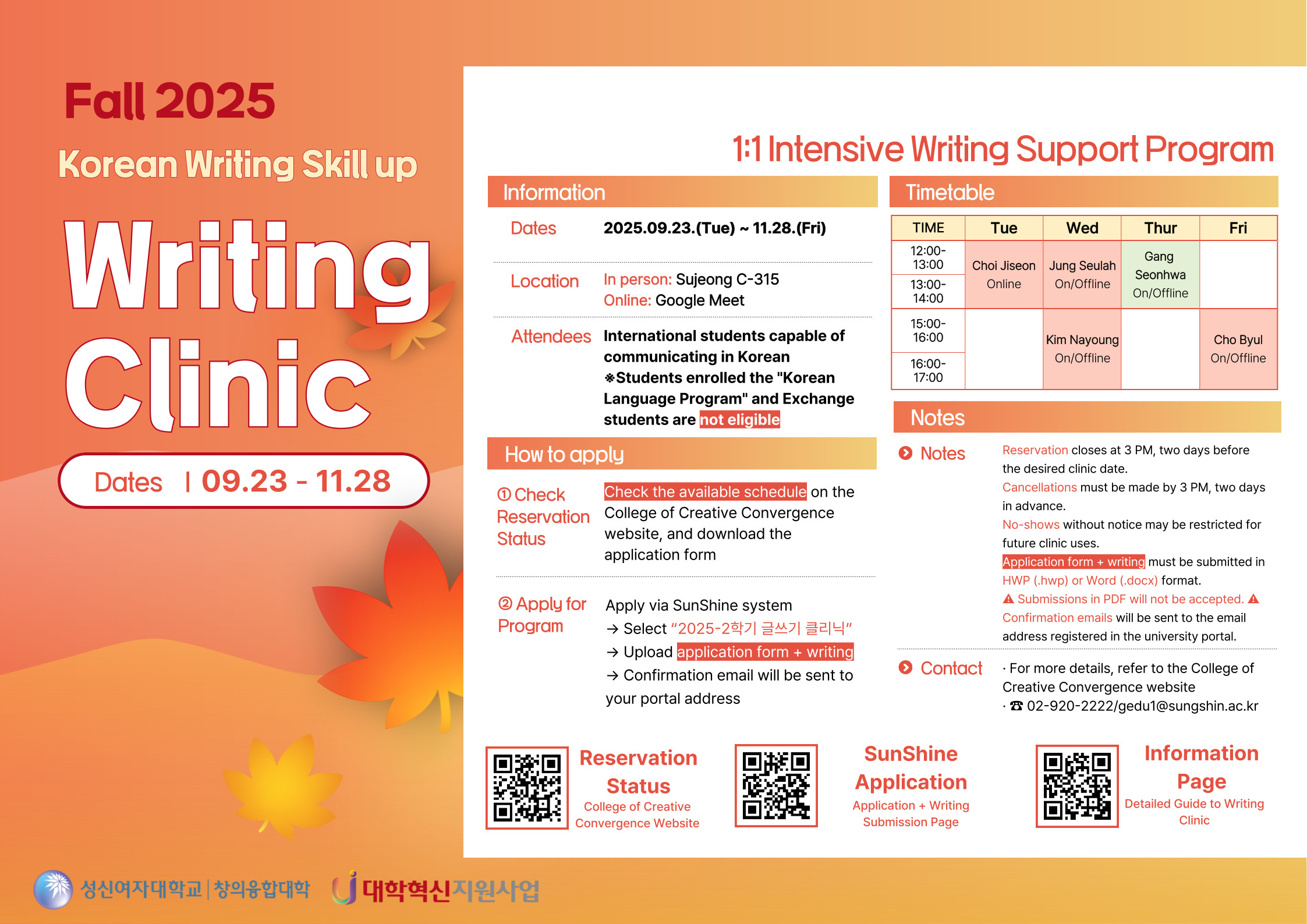 - 대면: 돈암수정캠퍼스 수정관 C315호 글쓰기 클리닉실