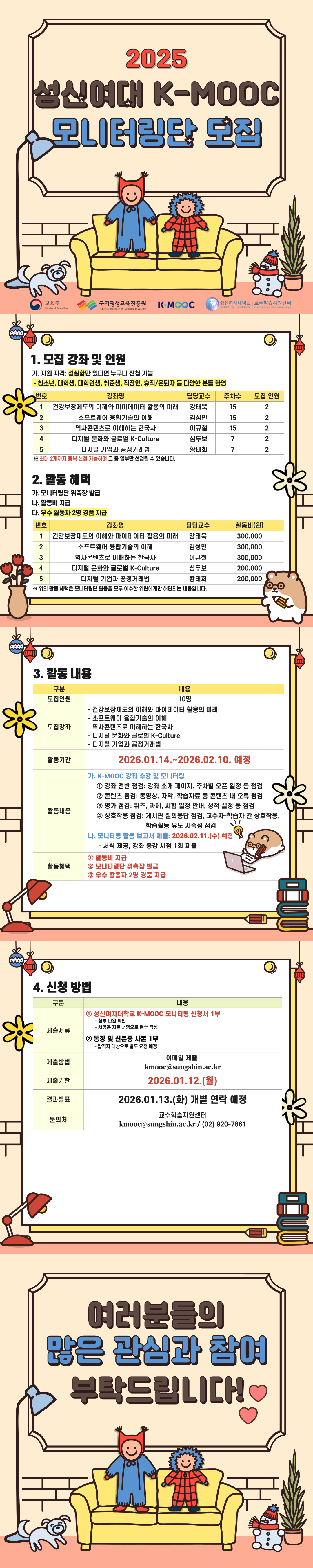 [교수학습지원팀] 2025년 K-MOOC 신규강좌 모니터링단 모집 (~26.01.12까지)