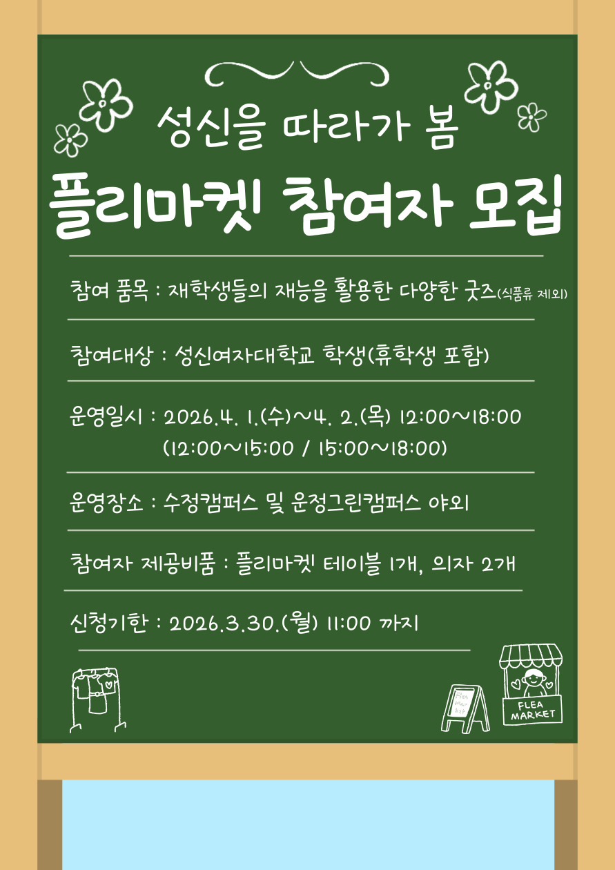 학생지원팀에서는 캠퍼스의 낭만과 힐링을 느낄 수 있는 '성신을 따라가 봄' 행사에 플리마켓 참여자를 모집하오니, 관심있는 학생들은 신청하여 주시기 바랍니다.