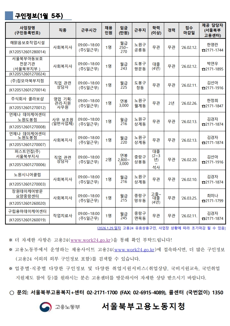 [대학일자리플러스센터] 서울북부고용복지센터 구인정보(1월 5주)