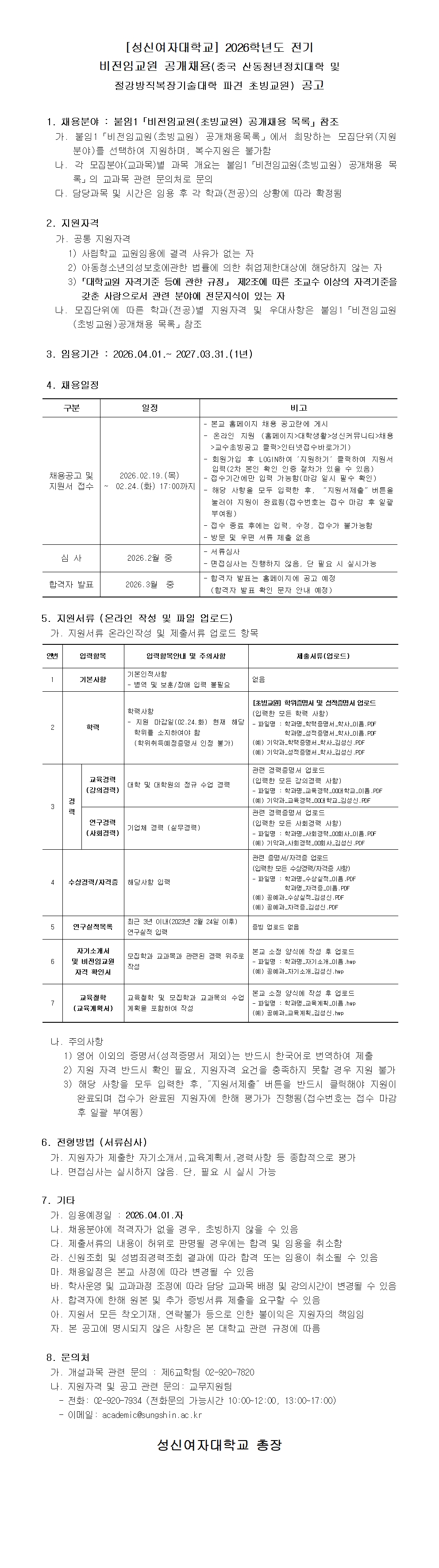 성신여자대학교 2026학년도 전기 비전임교원 공개채용(중국 산동청년정치대학 및 절강방직복장직업기술대학 파견 초빙교원) 공고