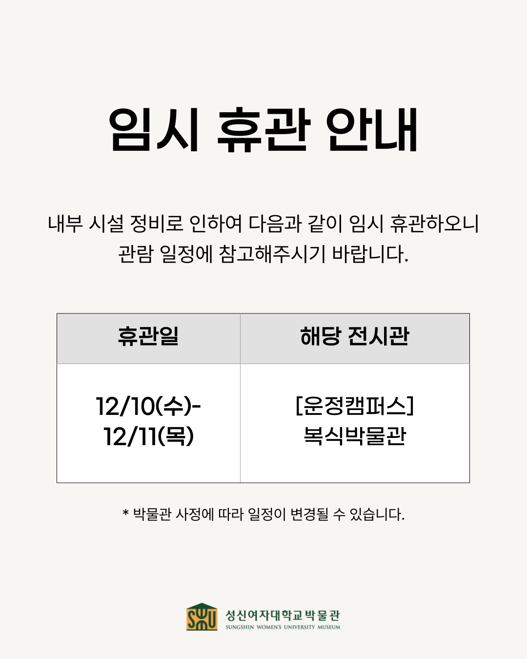 성신여자대학교 정원박광훈복식박물관 임시 휴관 안내(12/10-12/11)
