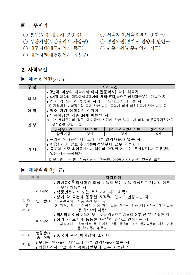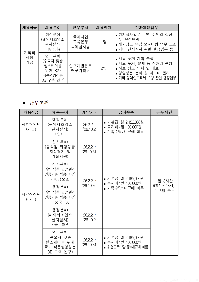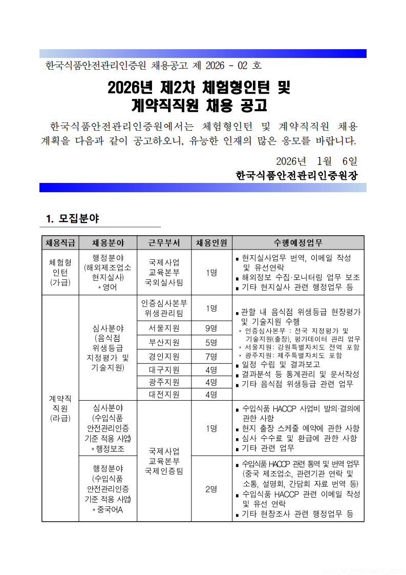 2026년 한국식품안전관리인증원 체험형인턴 및 계약직 직원 채용 안내