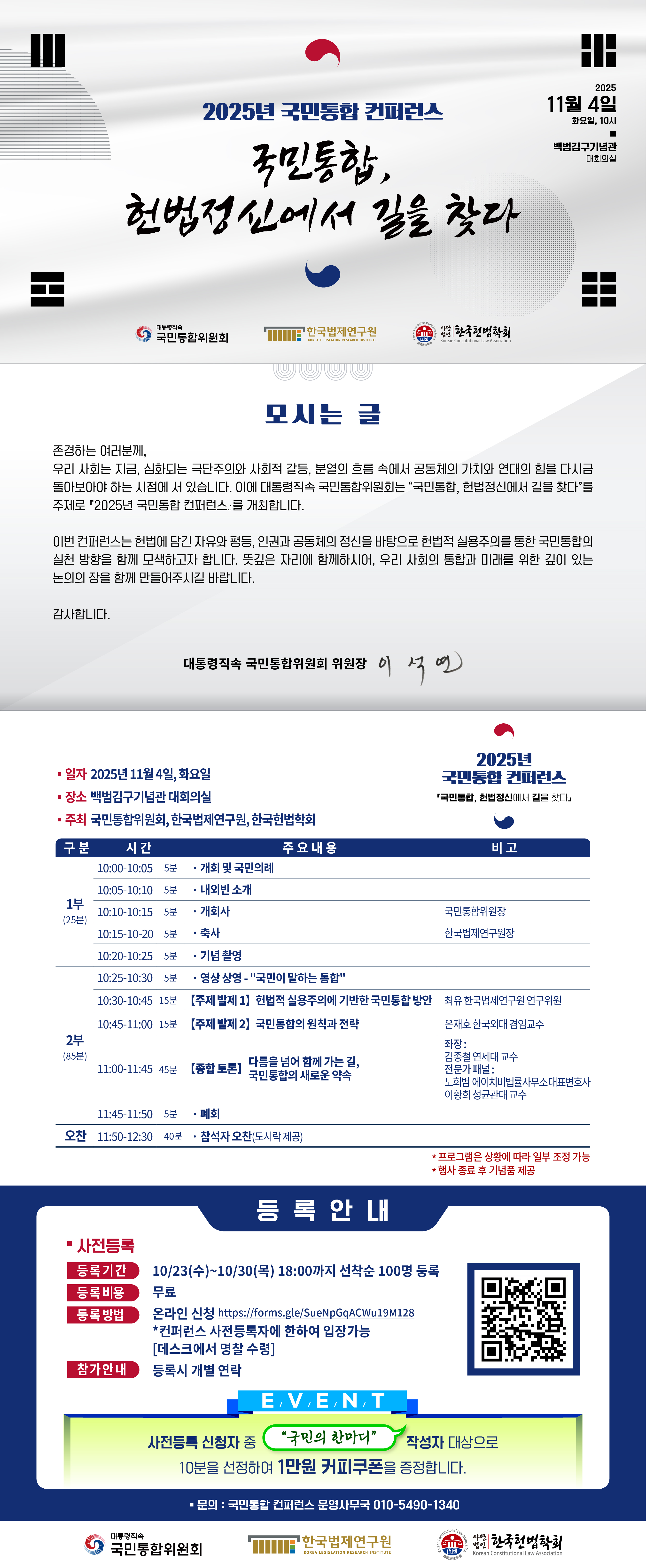 국민통합위원회에서 오는 11월 4일, "국민통합, 헌법정신에서 길을 찾다"를 주제로 2025 국민통합 컨퍼런스를 진행합니다. 관심 있는 학생분께서는 아래의 내용 참고 바랍니다.