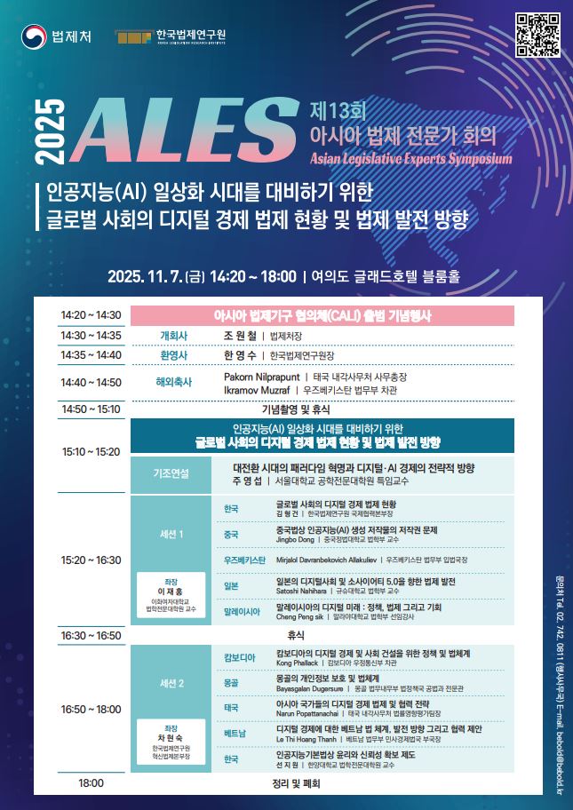 법제처에서 제13회 아시아 법제 전문가 회의(ALES)를 개최하오니 관심 있는 학생분들께서는 아래의 내용 참고 바랍니다.
