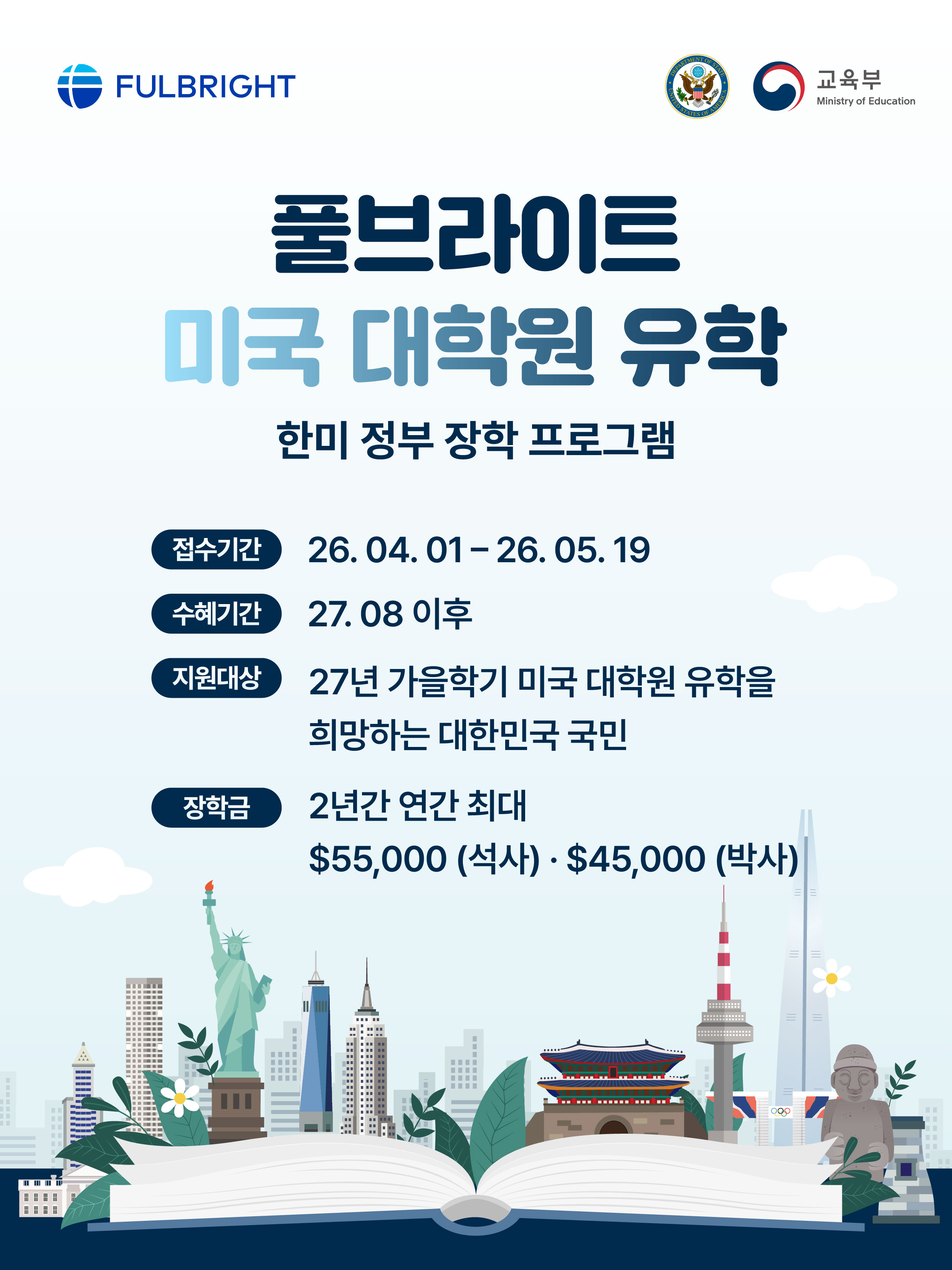 한미교육위원단에서 한국과 미국 정부의 후원으로 운영하는 [풀브라이트 미국 대학원 장학 프로그램]의 선발 공고를 안내합니다.