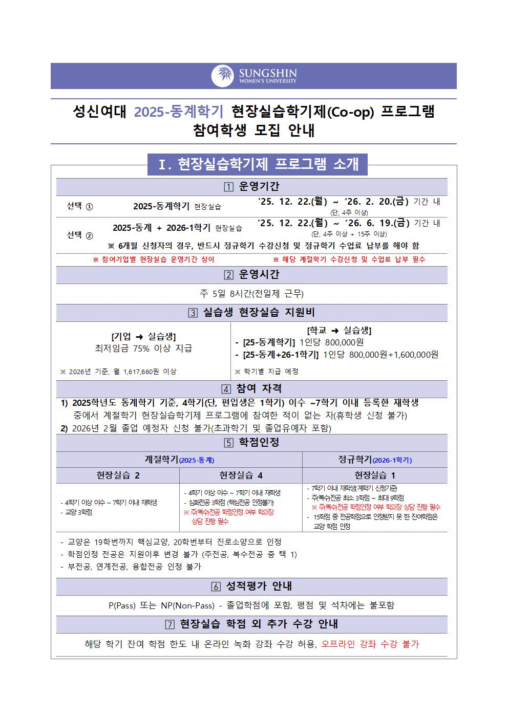 2025-동계 현장실습학기제(Co-op) 참여학생 모집 안내