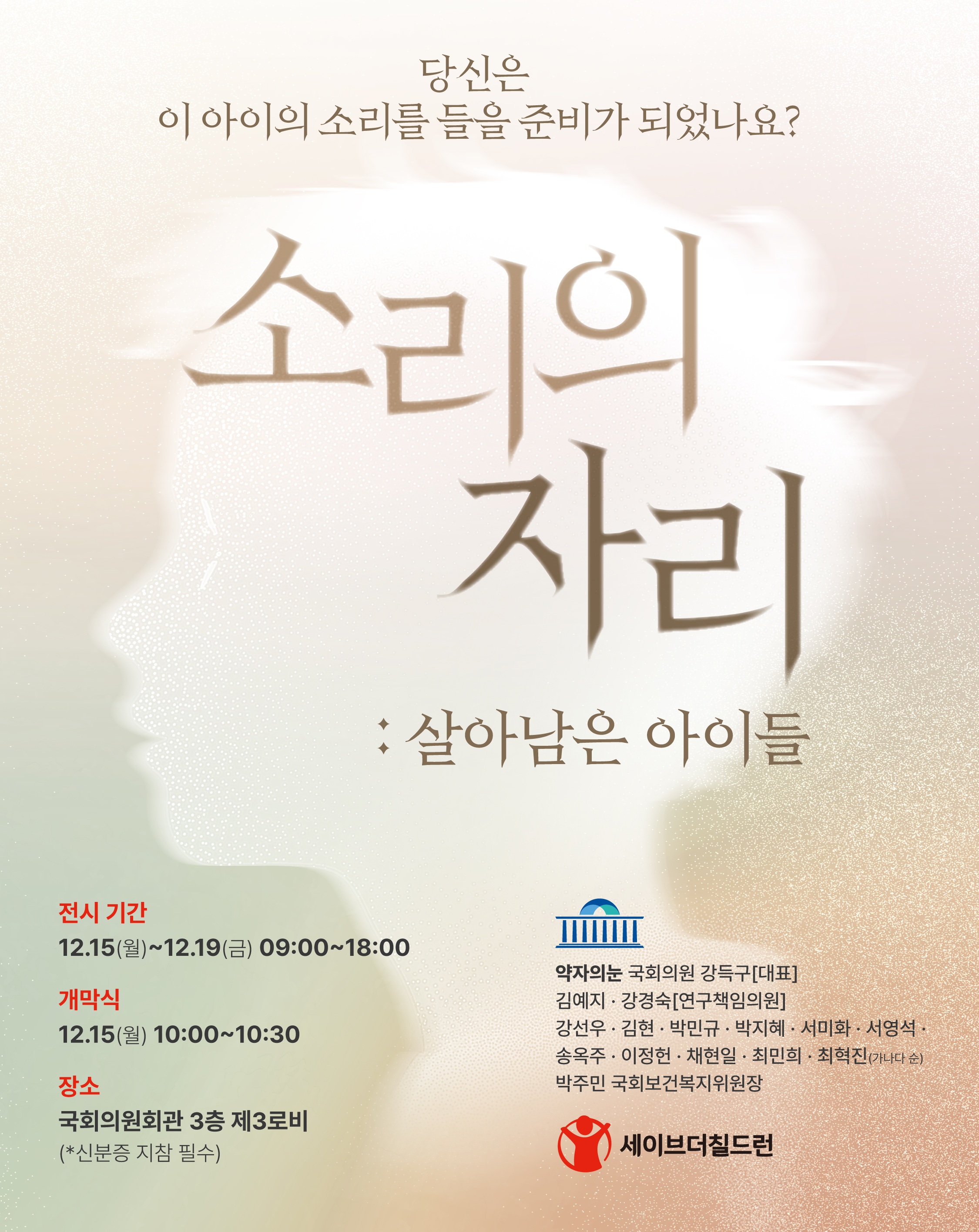 세이브더칠드런은 자녀 살해 후 자살 사건에서 살아남은 아이들의 목소리를 담은 <소리의 자리: 살아남은 아이들> 국회전시에 여러분을 초대합니다.