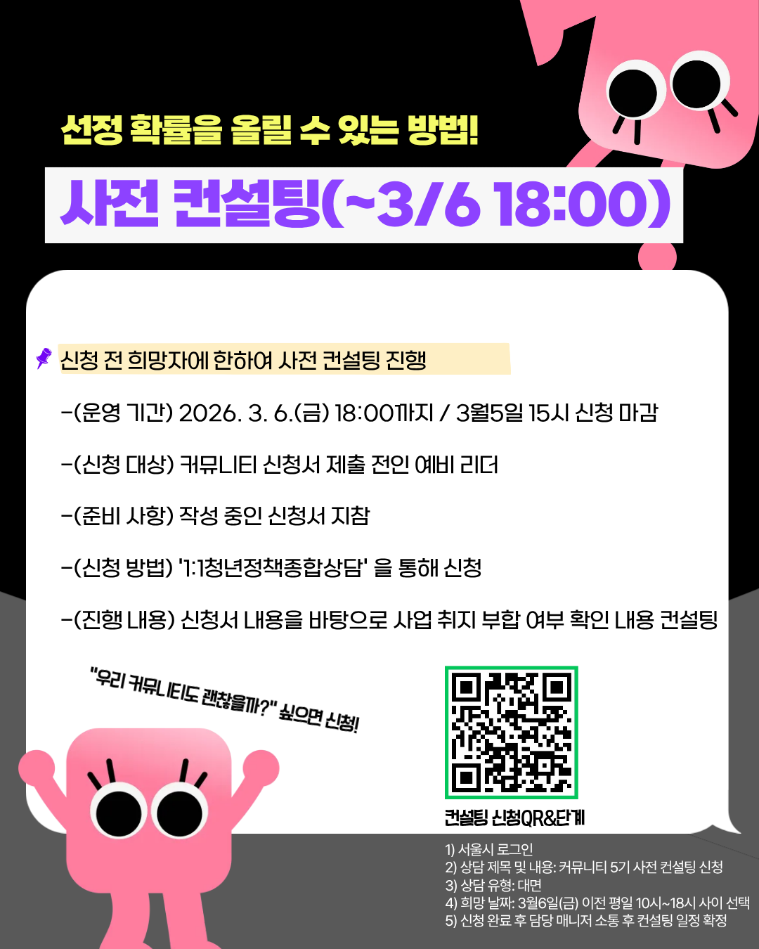 서울청년센터 성북은 강북구 생활권 청년들이 공통의 관심사를 바탕으로 함께 활동하며 성장할 수 있도록 지원하는 '커뮤니티 5기'의 리더(팀장)를 모집하고 있습니다.
