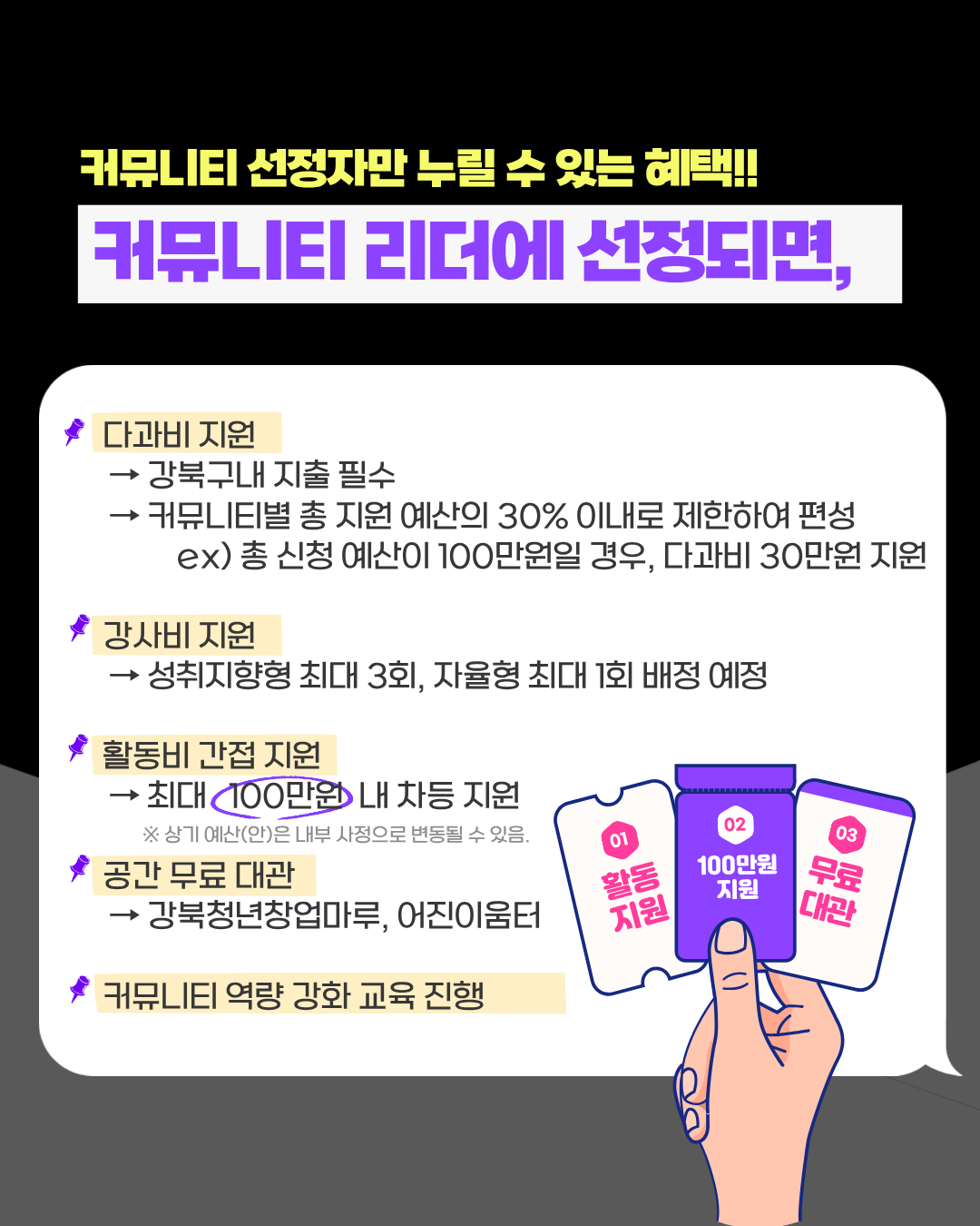 강사비 지원 (유형별 1~3회) 및 공간(강북청년창업마루 등) 무료 대관
