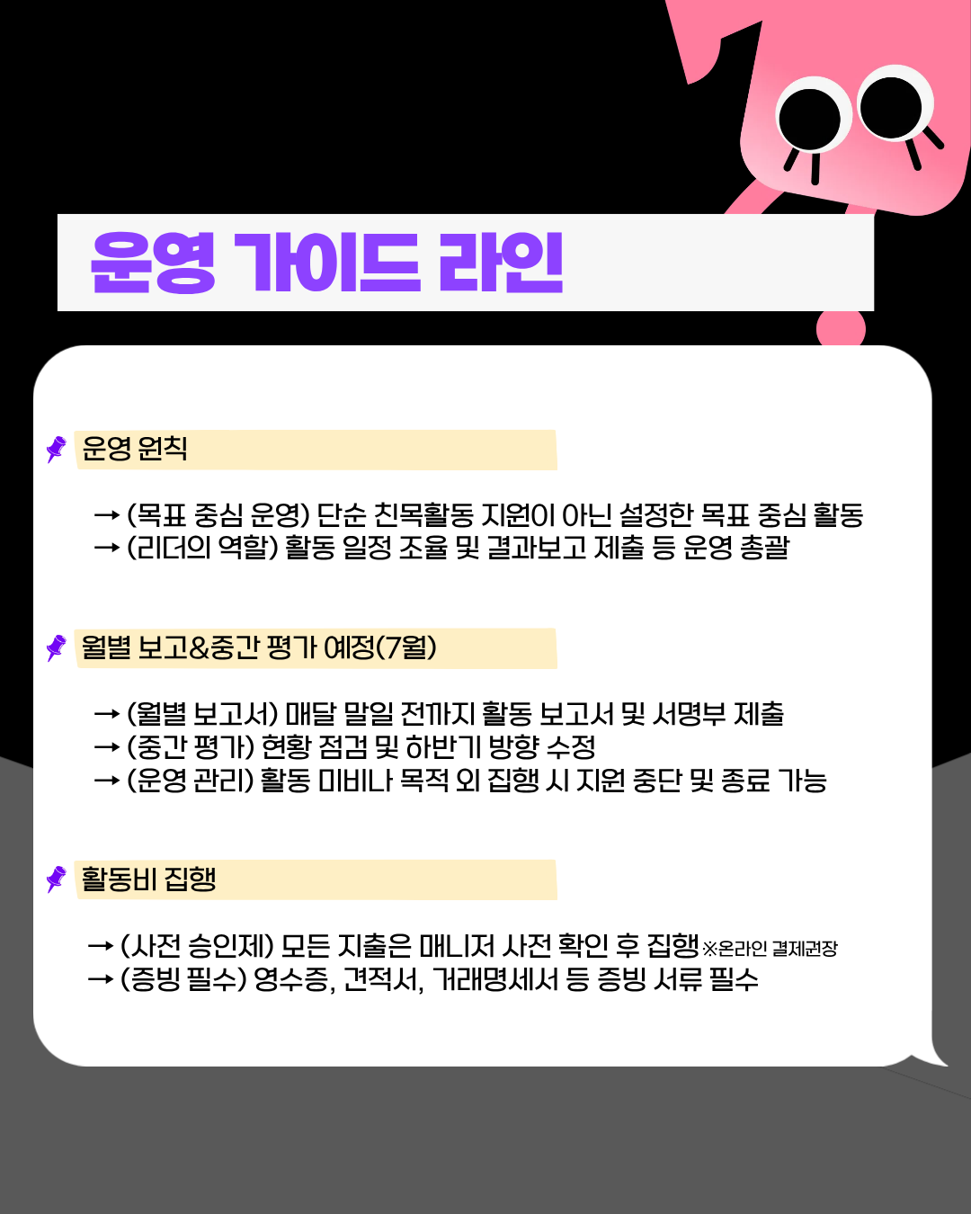 올해는 활동비 및 강사비 지원, 공간 대관 등 더욱 탄탄해진 혜택으로 청년들의 주체적인 활동을 돕고자 합니다.