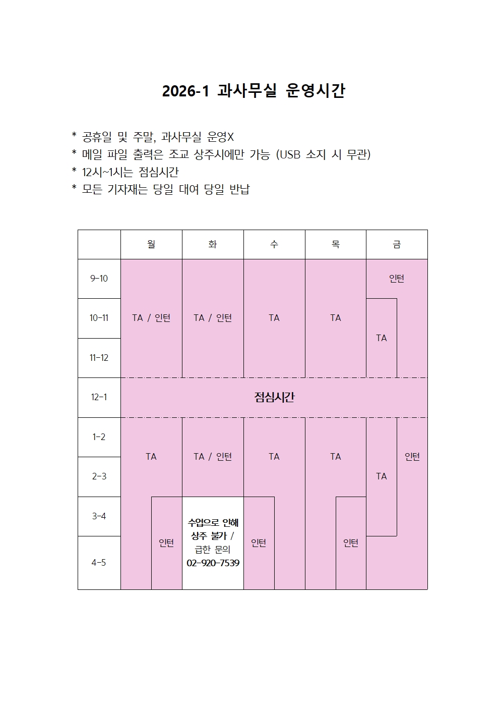 2026) 1학기 과사무실 운영 시간표