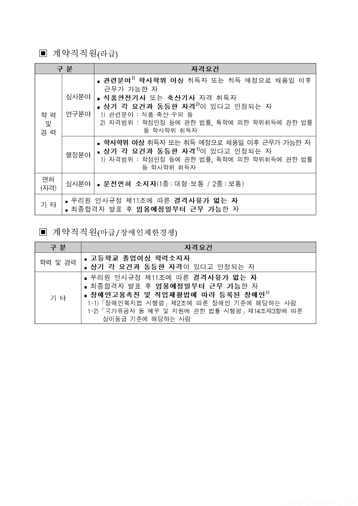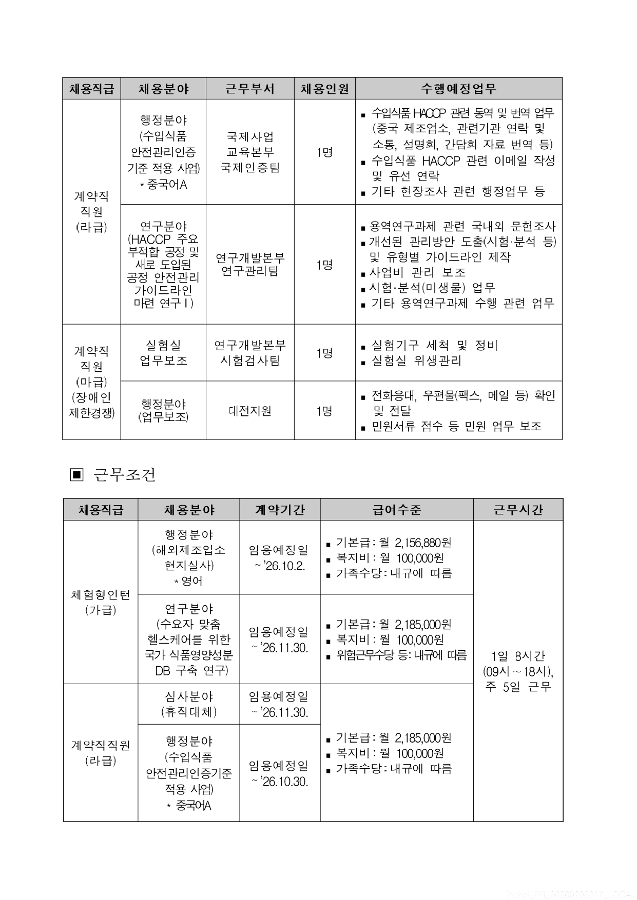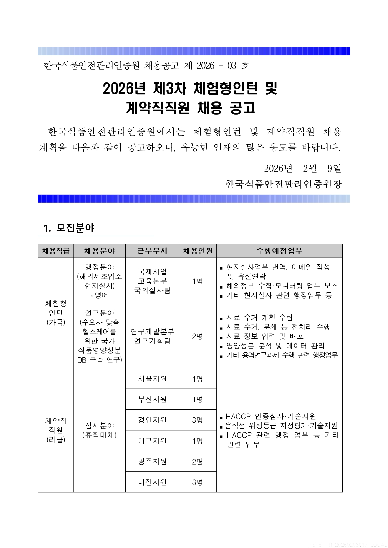 fnctId=bbs,fnctNo=4521 2026년 한국식품안전관리인증원 체험형인턴 및 계약직 직원 채용 안내(3차) 작성일 2026.02.13 수정일 2026.02.13 작성자 바이오헬스융합학부 조회수 108 글번호 151779 첨부파일 [채용공고문] 2026년 제3차 체험형인턴 및 계약직직원 채용.pdf 미리보기