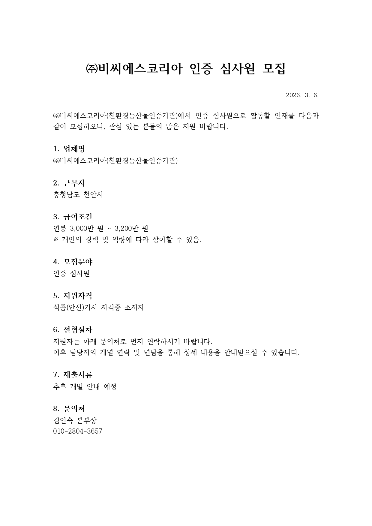 fnctId=bbs,fnctNo=4521 [비씨에스코리아] 인증 심사원 모집 안내 작성일 2026.03.09 수정일 2026.03.09 작성자 바이오헬스융합학부 조회수 17 글번호 152500 첨부파일 첨부파일이(가) 없습니다.
