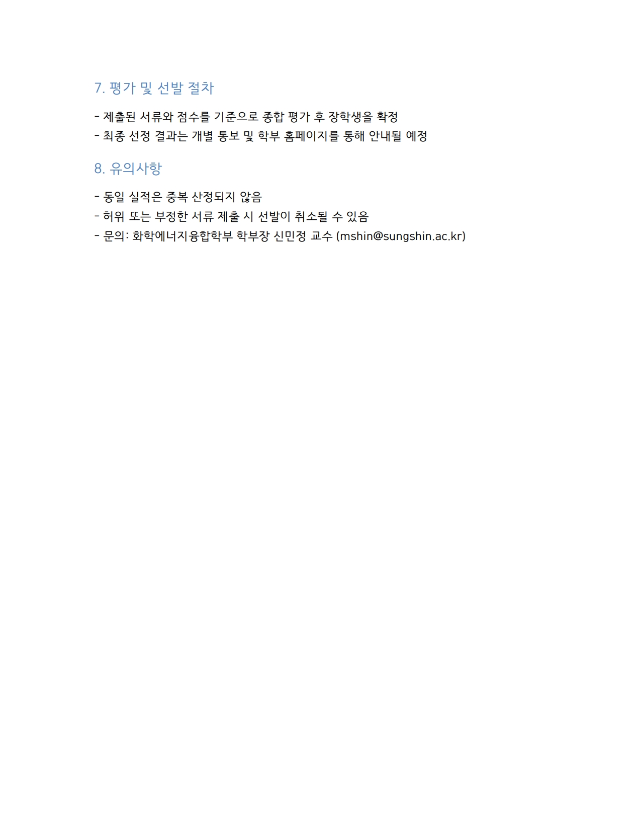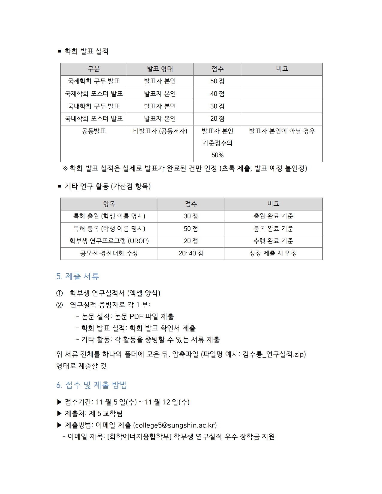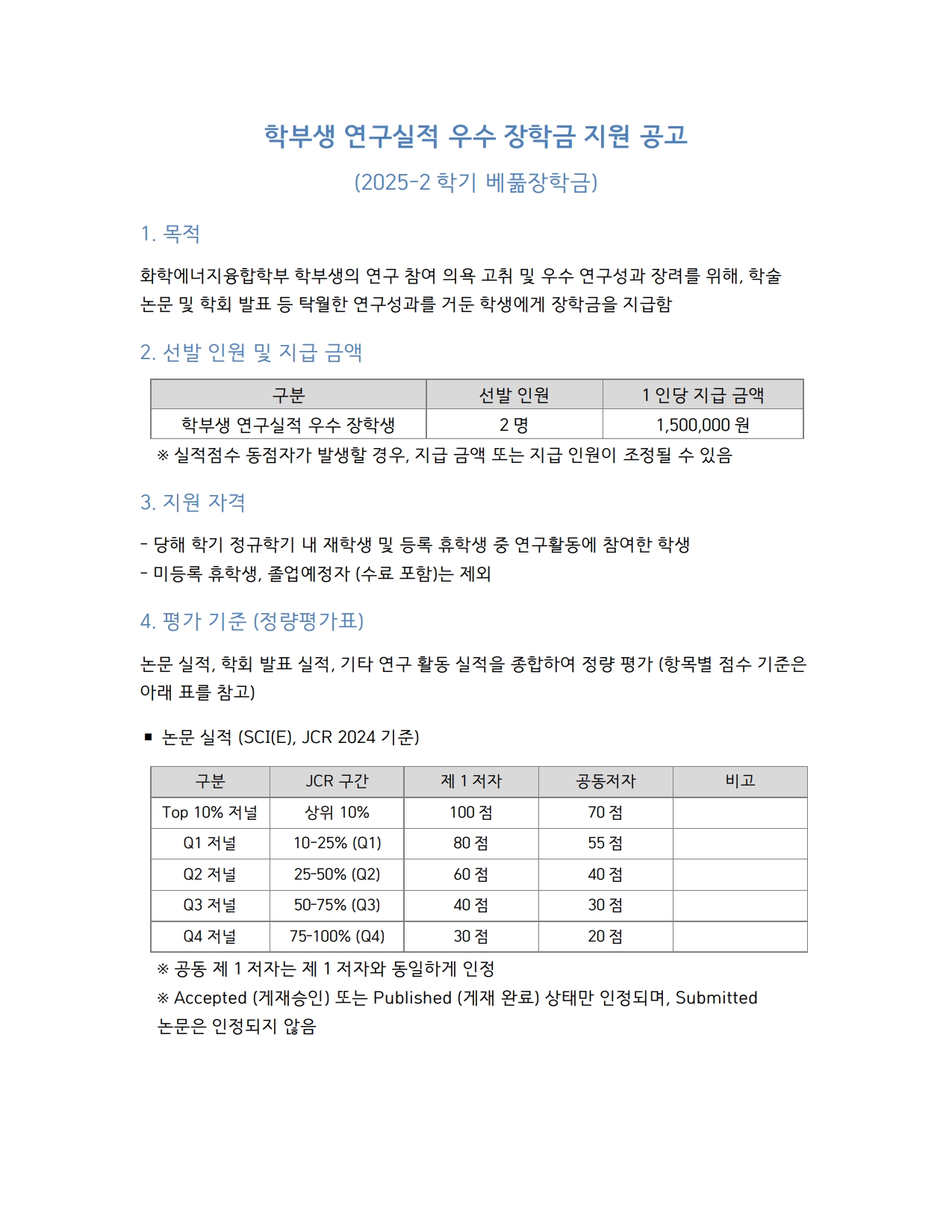 fnctId=bbs,fnctNo=4482 학부생 연구실적 우수 장학금 지원 공고(2025-2학기 베풂장학금) 작성일 2025.11.05 수정일 2025.11.05 작성자 화학에너지융합학부 조회수 115 글번호 148602 첨부파일 학부생 연구실적서_양식.xlsx 미리보기
