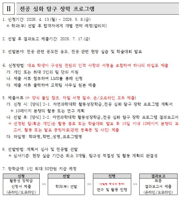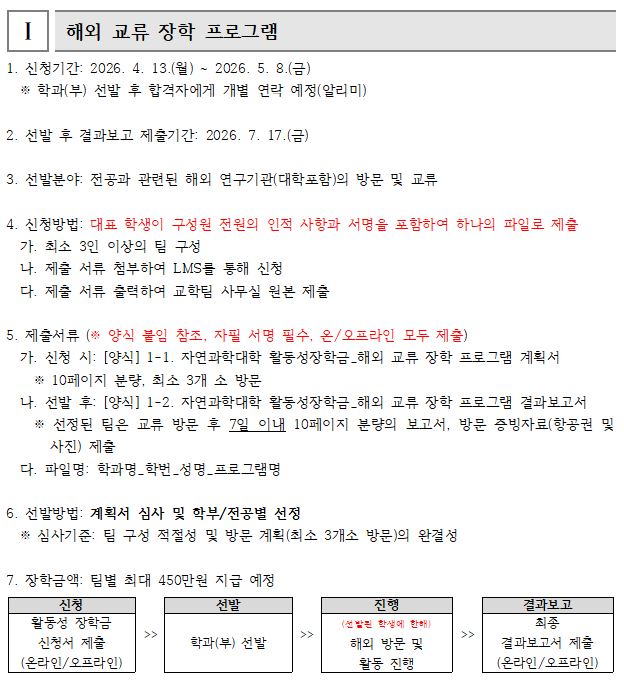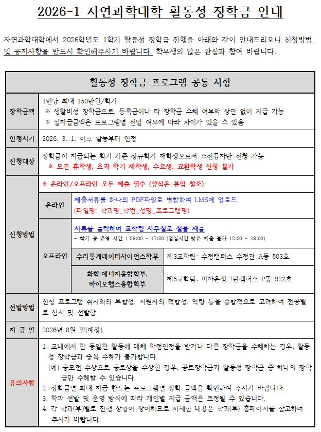 fnctId=bbs,fnctNo=4482 2026학년도 1학기 자연과학대학 활동성 장학금 안내 작성일 2026.04.09 수정일 2026.04.09 작성자 화학에너지융합학부 조회수 34 글번호 154045 첨부파일 [양식] 1-1. 자연과학대학 활동성장학금_해외 교류 장학 프로그램 계획서.hwp 미리보기 [양식] 1-2. 자연과학대학 활동성장학금_해외 교류 장학 프로그램 결과보고서.hwp 미리보기 [양식] 2-1. 자연과학대학 활동성장학금_전공 심화 탐구 장학 프로그램 계획서.hwp 미리보기 [양식] 2-2. 자연과학대학 활동성장학금_전공 심화 탐구 장학 프로그램 결과보고서.hwp 미리보기