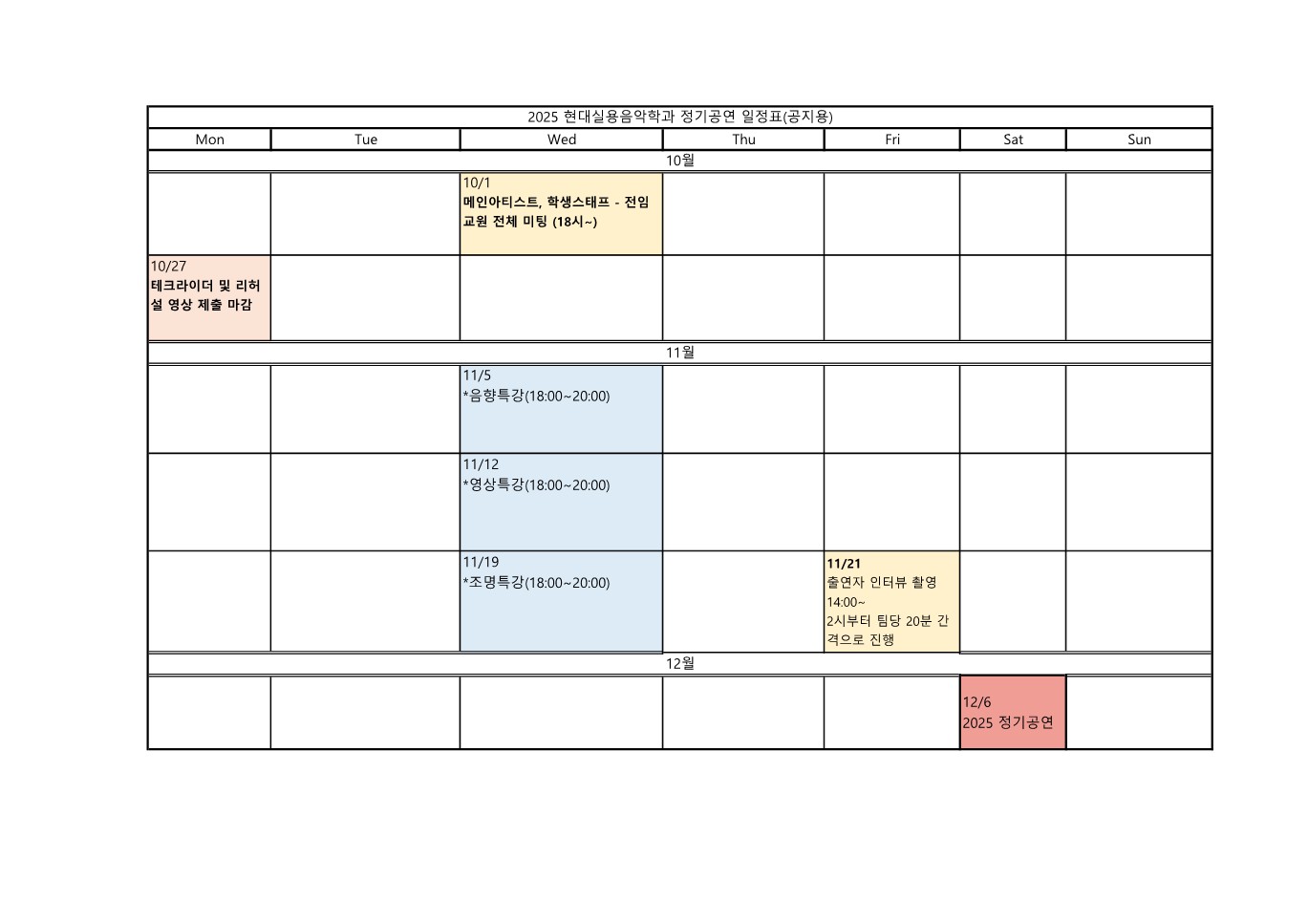 11월5일(수) / 11월12일(수) / 11월19일(수) 음향 영상 조명 특강은 SCAF 메인 아티스트와 스텝 도우미들이 필참하여야 합니다.