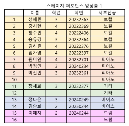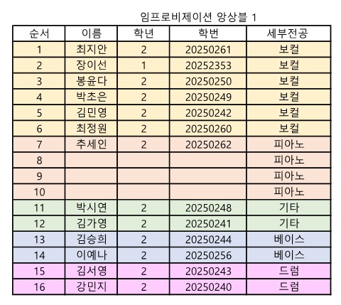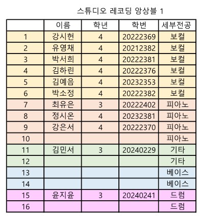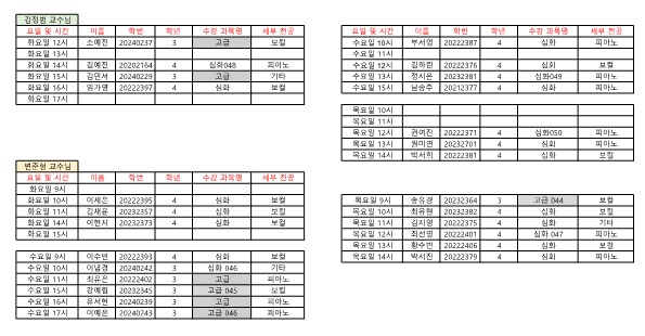 전임교원 전공실기 및 2~4영역 앙상블 수업 신청자 명단이 확정되었으니 아래 표를 확인하시어 이상이 있을 시 학과로 회신 주시기 바랍니다.
