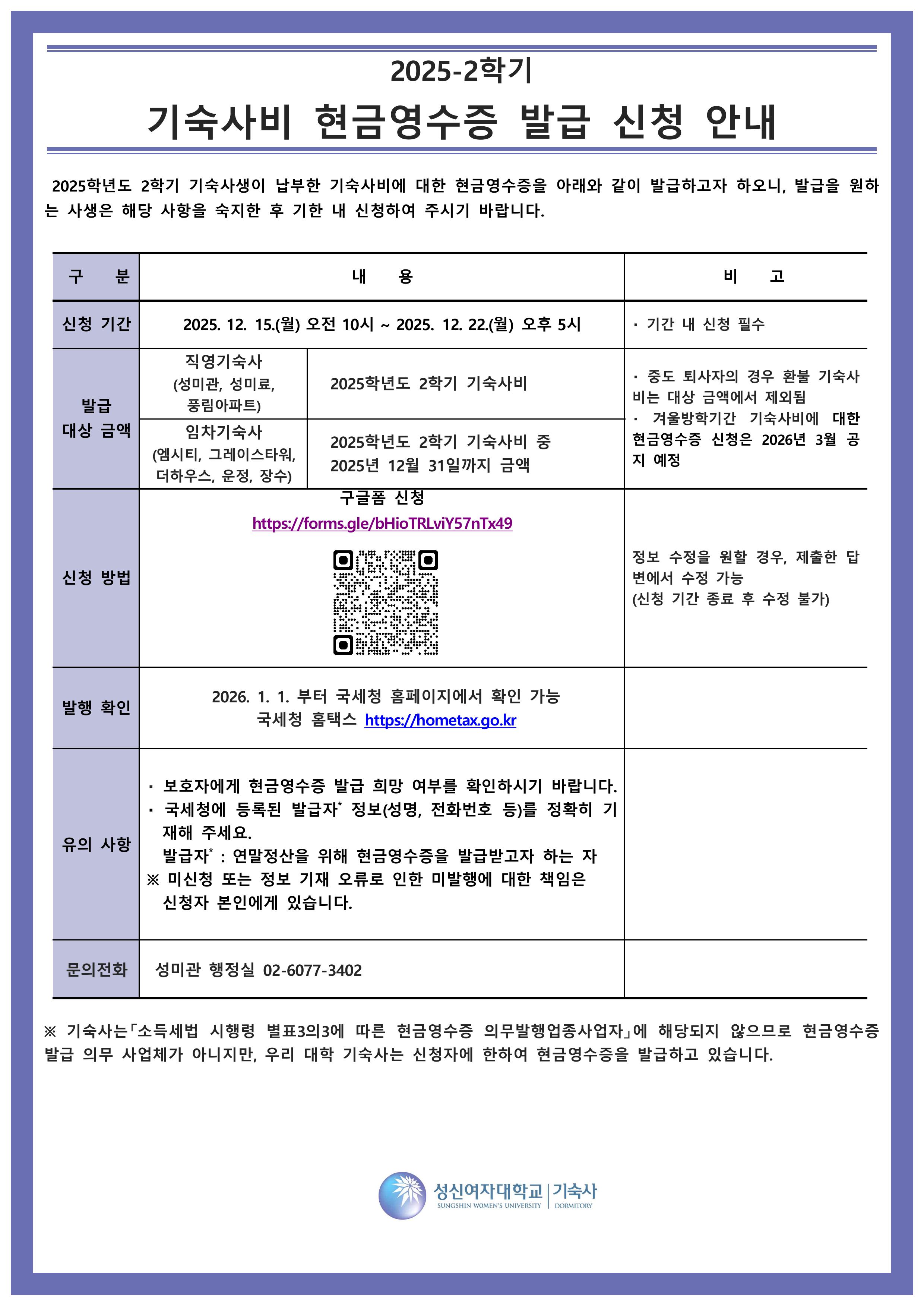 fnctId=bbs,fnctNo=4077 [일반] 2025-2학기 기숙사비 현금영수증 발급 신청 안내 작성일 2025.12.12 수정일 2025.12.12 작성자 기숙사 조회수 318 글번호 149891 첨부파일 2025-2 현금영수증 신청안내.pdf 미리보기