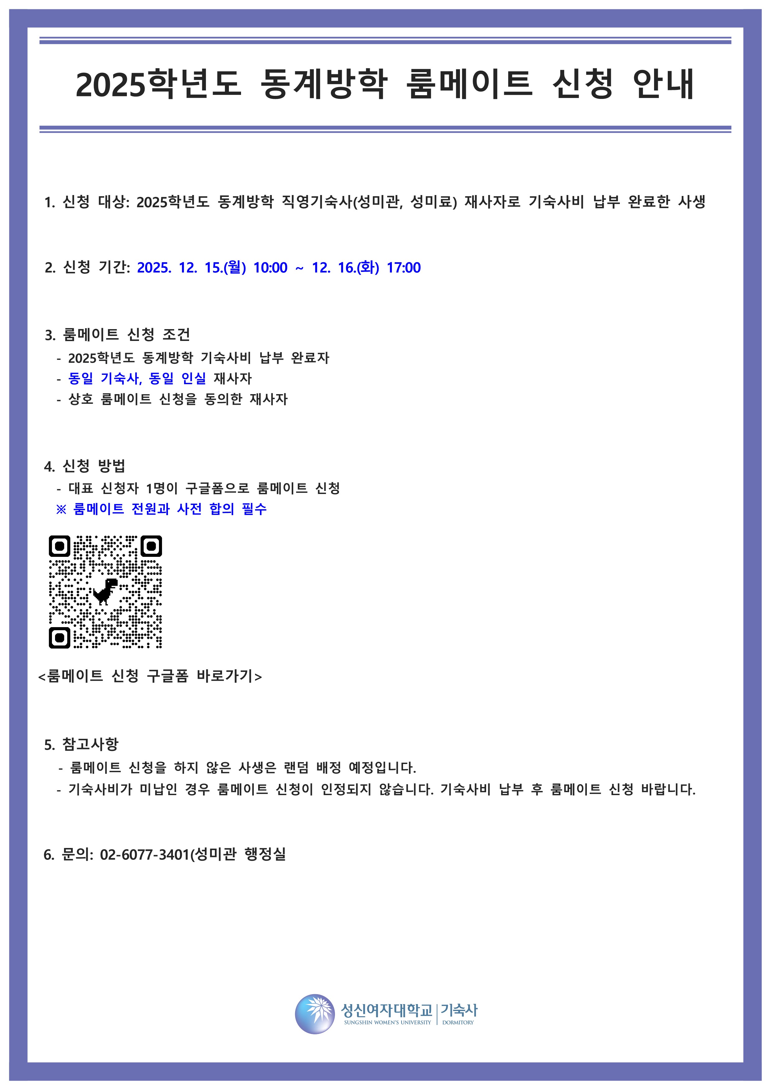 fnctId=bbs,fnctNo=4077 [일반] 2025학년도 동계방학 룸메이트 신청 안내 작성일 2025.12.12 수정일 2025.12.12 작성자 기숙사 조회수 107 글번호 149892 첨부파일 첨부파일이(가) 없습니다. ★룸메이트 신청 바로가기★