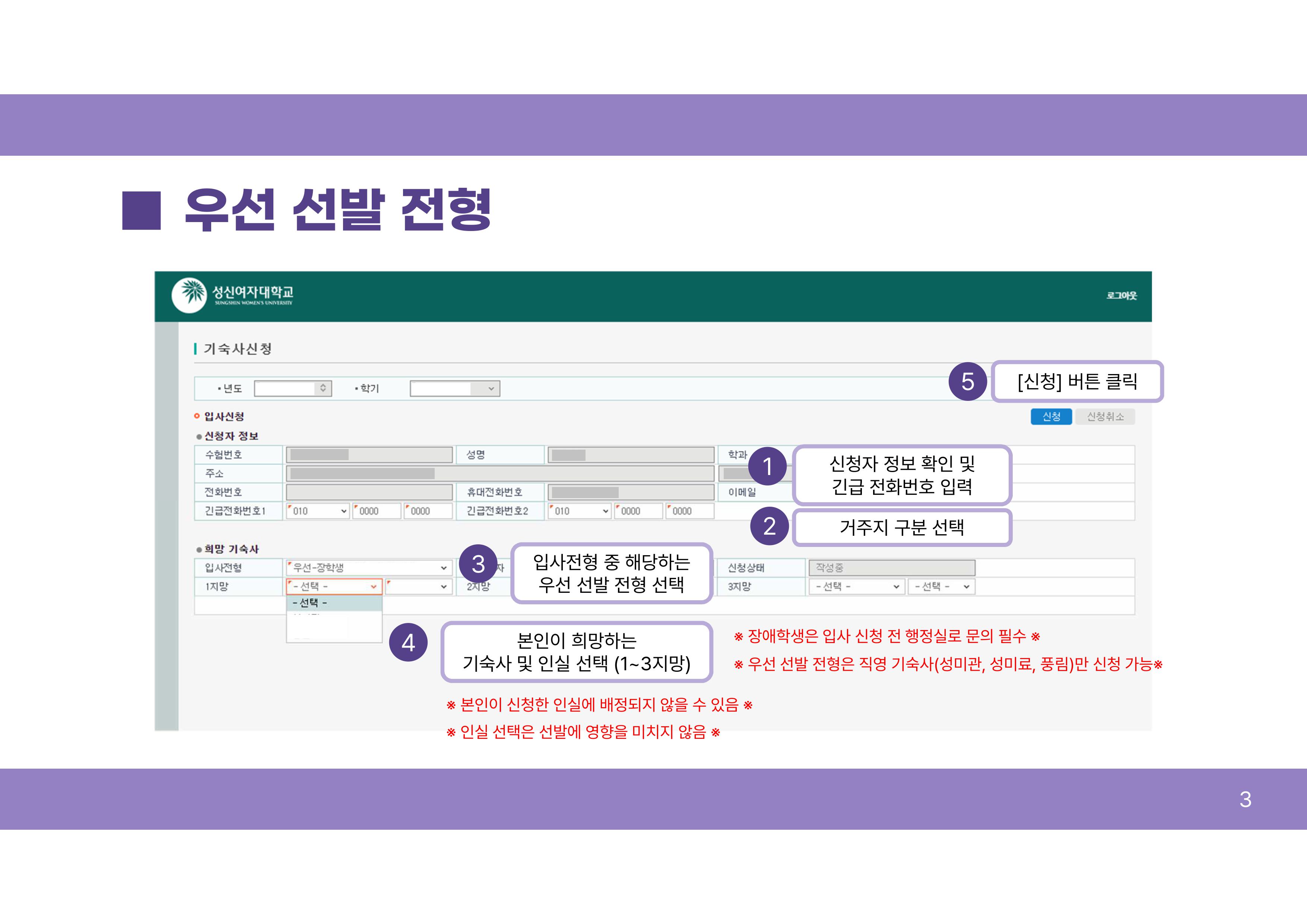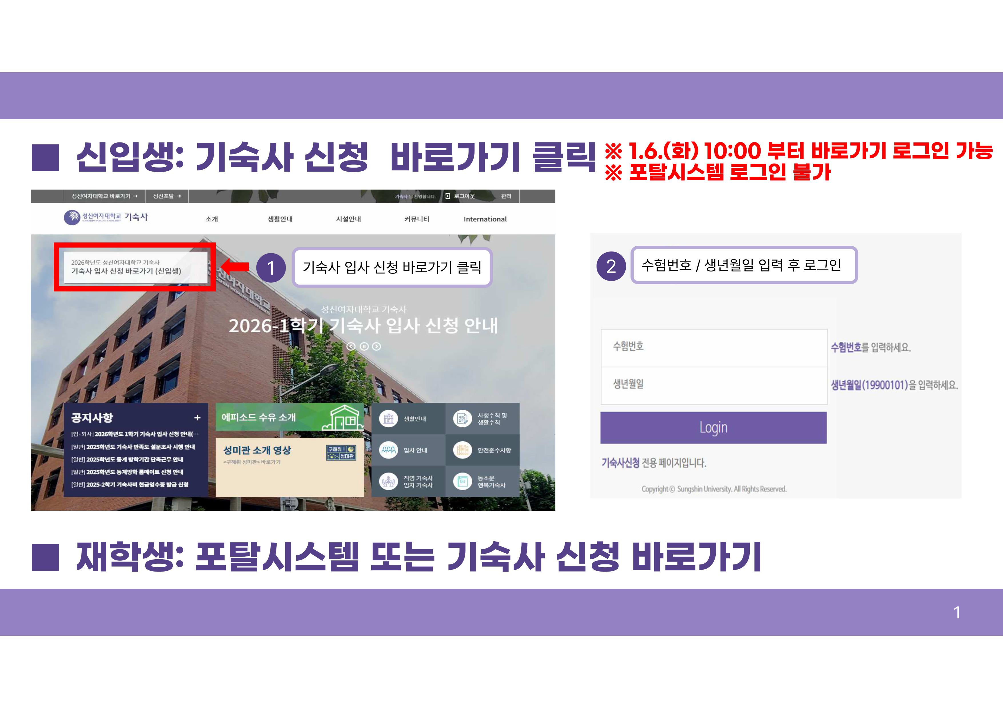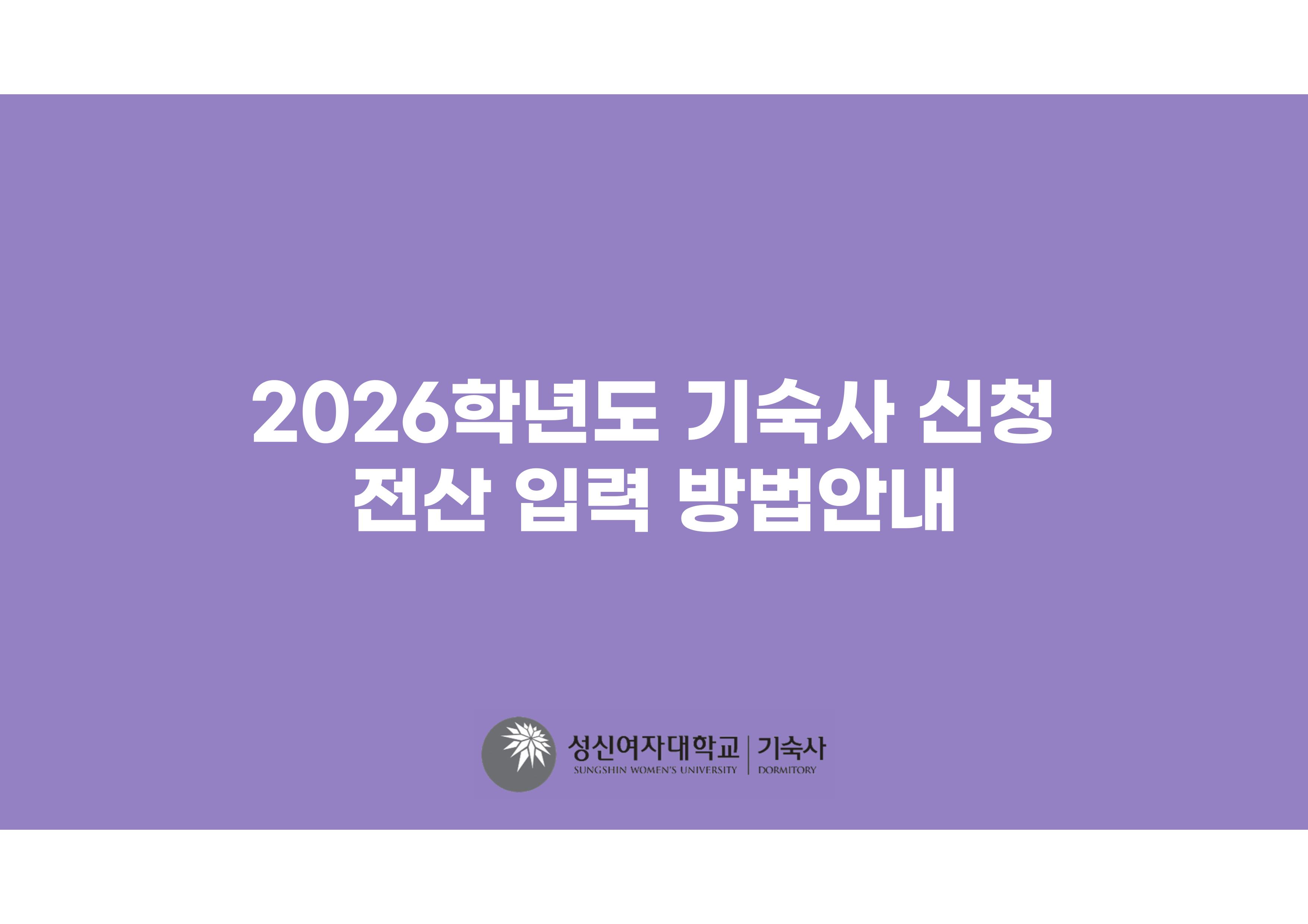 fnctId=bbs,fnctNo=4077 [입·퇴사] 2026학년도 1학기 기숙사 신청 전산 입력 방법안내 작성일 2026.01.05 수정일 2026.01.05 작성자 기숙사 조회수 1056 글번호 150471 첨부파일 2026학년도 기숙사 신청 전산 입력 방법안내.pdf 미리보기