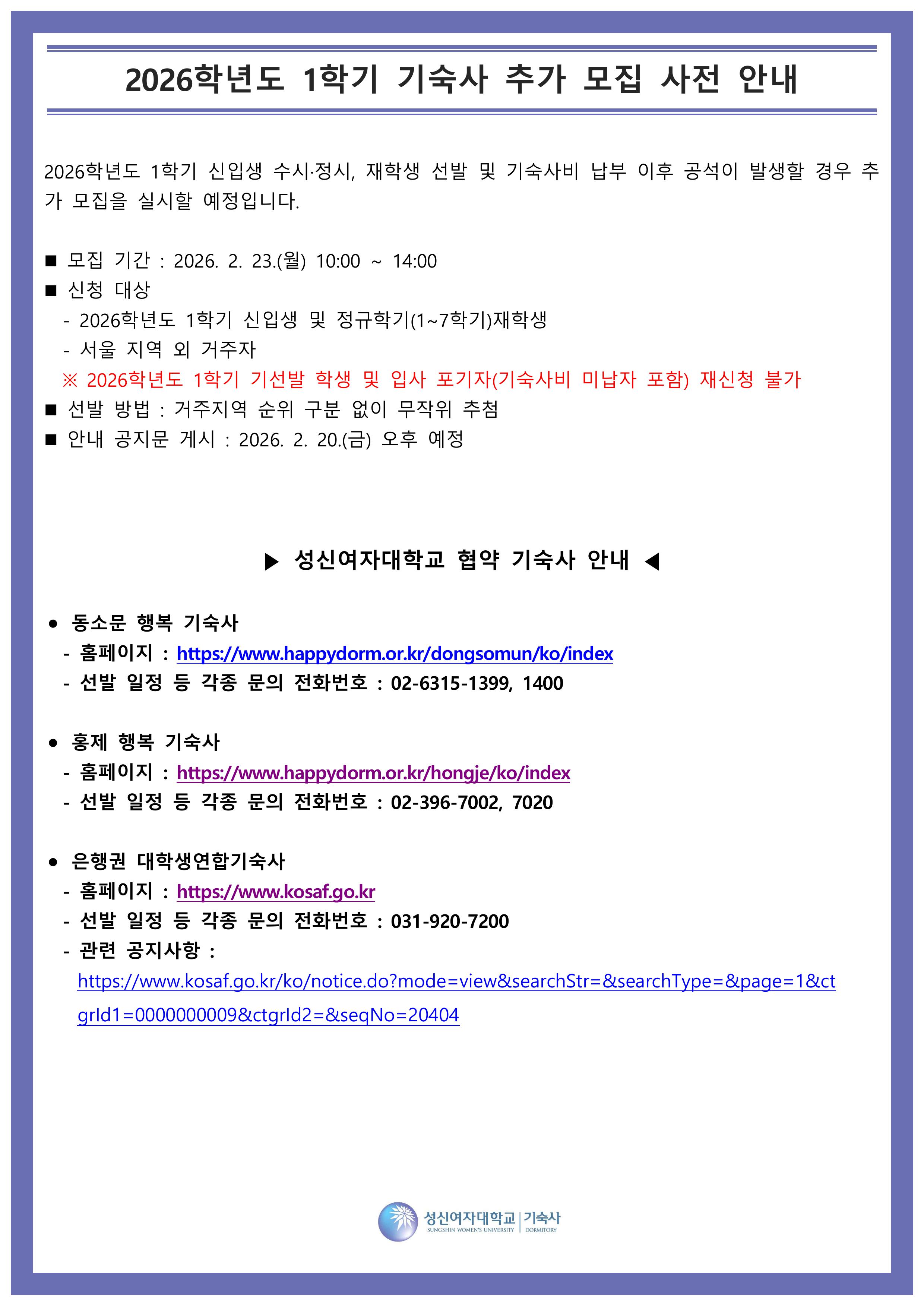 fnctId=bbs,fnctNo=4077 [입·퇴사] 2026학년도 1학기 기숙사 추가 모집 사전 안내 작성일 2026.01.14 수정일 2026.01.14 작성자 기숙사 조회수 3630 글번호 150764 첨부파일 2026학년도 1학기 기숙사 추가 모집 사전 안내.pdf 미리보기