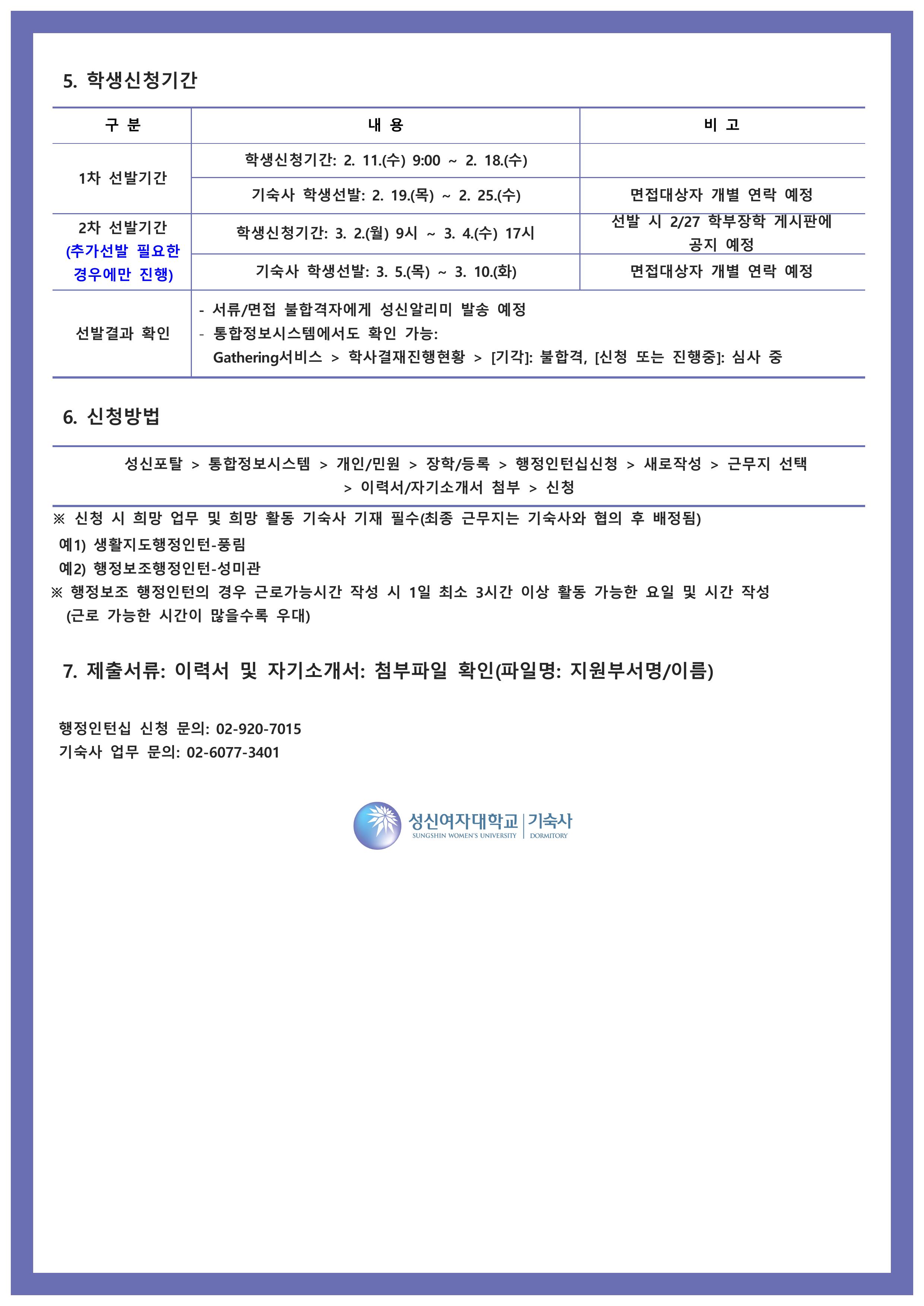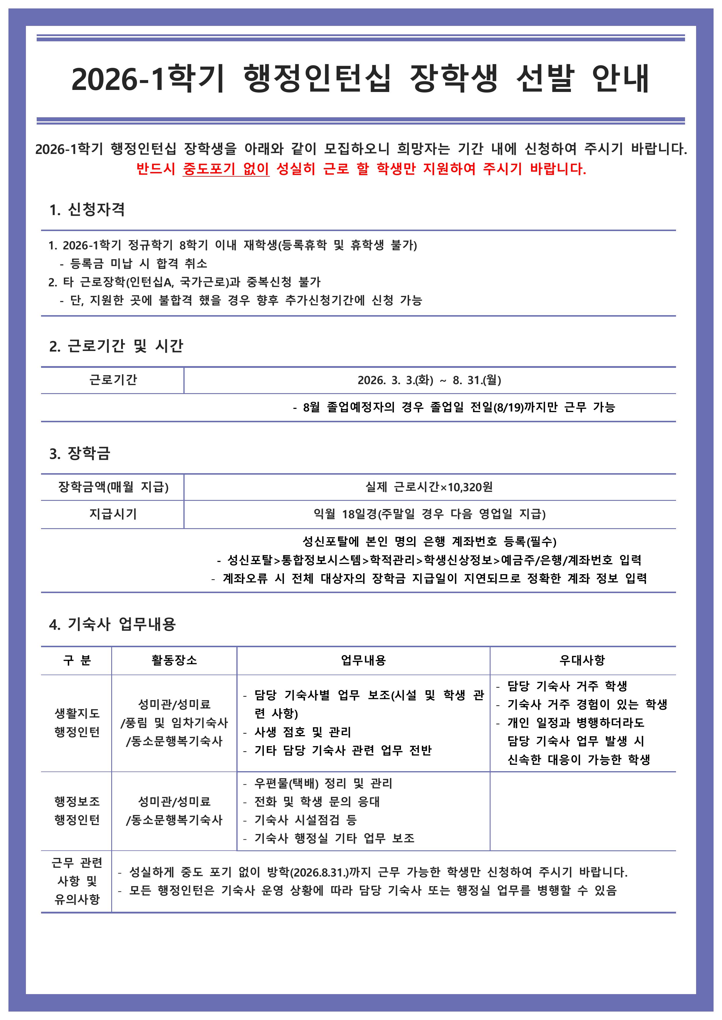 fnctId=bbs,fnctNo=4077 [일반] 2026-1학기 행정인턴십 모집 안내 작성일 2026.02.10 수정일 2026.02.10 작성자 기숙사 조회수 710 글번호 151669 첨부파일 26-1 행정인턴십 지원서(이력서 및 자기소개서).hwp 미리보기