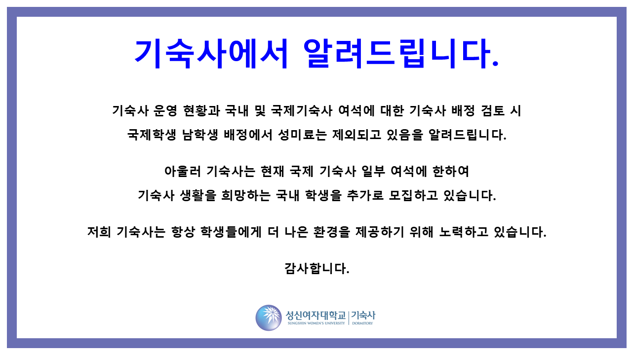 fnctId=bbs,fnctNo=4077 기숙사에서 알려드립니다 작성일 2026.03.16 수정일 2026.03.25 작성자 기숙사 조회수 376 글번호 152883 첨부파일 첨부파일이(가) 없습니다.