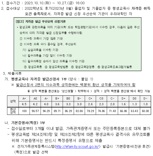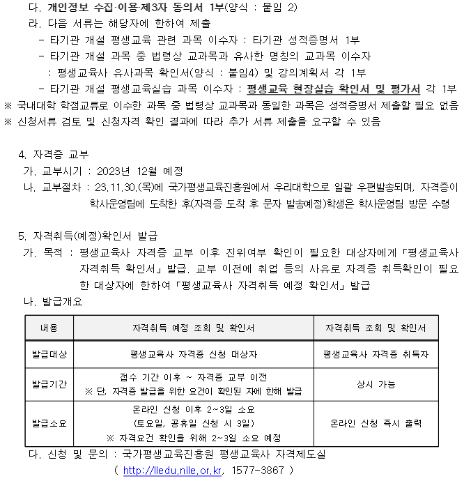 fnctId=bbs,fnctNo=3545 [학부] 2023년 제4차 평생교육사 자격증 발급 신청 안내 작성일 2023.10.04 수정일 2023.10.04 작성자 한문교육과 조회수 80 글번호 124113 첨부파일 붙임1._평생교육사_자격증_발급신청서(양식).hwp 미리보기 붙임2._개인정보수집이용제3자동의서(양식).hwp 미리보기 붙임3._평생교육사_자격증_등급별_자격요건_및_관련_과목.hwp 미리보기 붙임4._평생교육사_유사과목_확인서(양식).hwp 미리보기