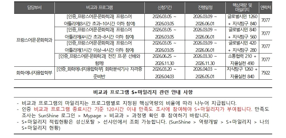 교육과정혁신팀에서는 재학생 여러분이 우리 대학 인재상에 부합하는 인재로 성장하는데 필요한 성신핵심역량을 개발하고 강화할 수 있도록 비교과 교육과정을 체계화하고 통합 관리하고 있습니다. 2026년 4월 비교과 프로그램을 다음과 같이 공지합니다. 재학생 여러분의 적극적인 관심과 참여를 부탁드립니다.