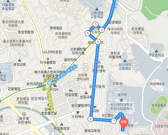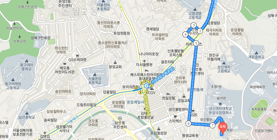 From Miari: After Miari Skybridge, go straight (300M) > Turn right at Dongseon1-dong (60M) > Turn left at Dongseon 2-dong(80M) > Turn left at Dongseon 2-dong (90M) > Turn right at Dongseon 1-dong (underground pass) > Go straight from Sungshin Women's University intersection > Turn right at Media Information Center of Sungshin Women's University > After the bus stop, turn left >Rear gate of Sungshin Women's University