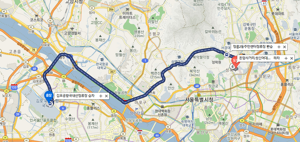 - By bus: Trunk line (B) : Catch the Bus 601 from Gimpo Airport ― Get off at the Changdeokgung Palace station ― transfer to the Bus 151 ― Get off at the Donam Intersection/Sungshin Women's University station Airport Limousine Bus : Get into City Airport Limousine Bus (for Jungrang and Seongbuk) ― Get off at the Gireum Station ― Walk toward Samsung Raemian Apartment station(takes about 8 minutes) ― Catch the Seongbuk 20 at the Samsung Raemian Apartment Bus Stop ― Get off at the Poonglim Apartment & Sungshin Elementary School