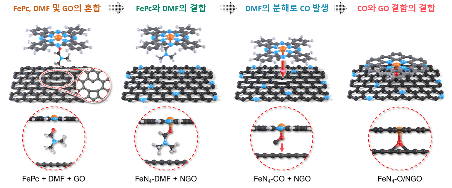 이세현 교수 연구팀은 이를 해결하기 위해 철 프탈로시아닌(FePc)과 그래픽 산화물(GO)을 활용하여 기존의 합성법보다 훨씬 간단하고 빠르게 철 기반 단원자 촉매를 합성하는 방법을 개발했다.