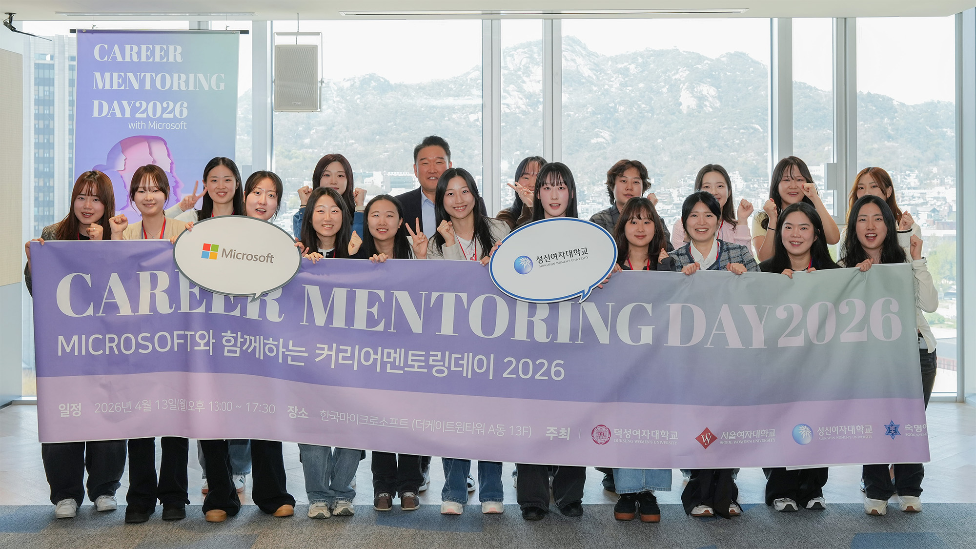 성신여대 학생들이 'Microsoft와 함께하는 커리어멘토링데이 2026' 행사에서 기념촬영을 하고 있다.