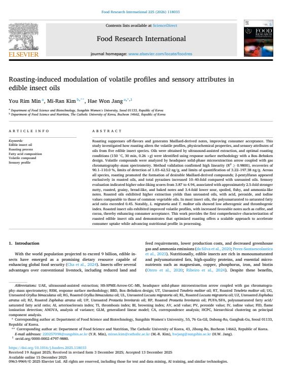 [미래응용과학학과] 민유림 박사과정생, 로스팅 공정 기반 식용곤충 유래 오일 연구 논문 국제 저명 학술지 게재
