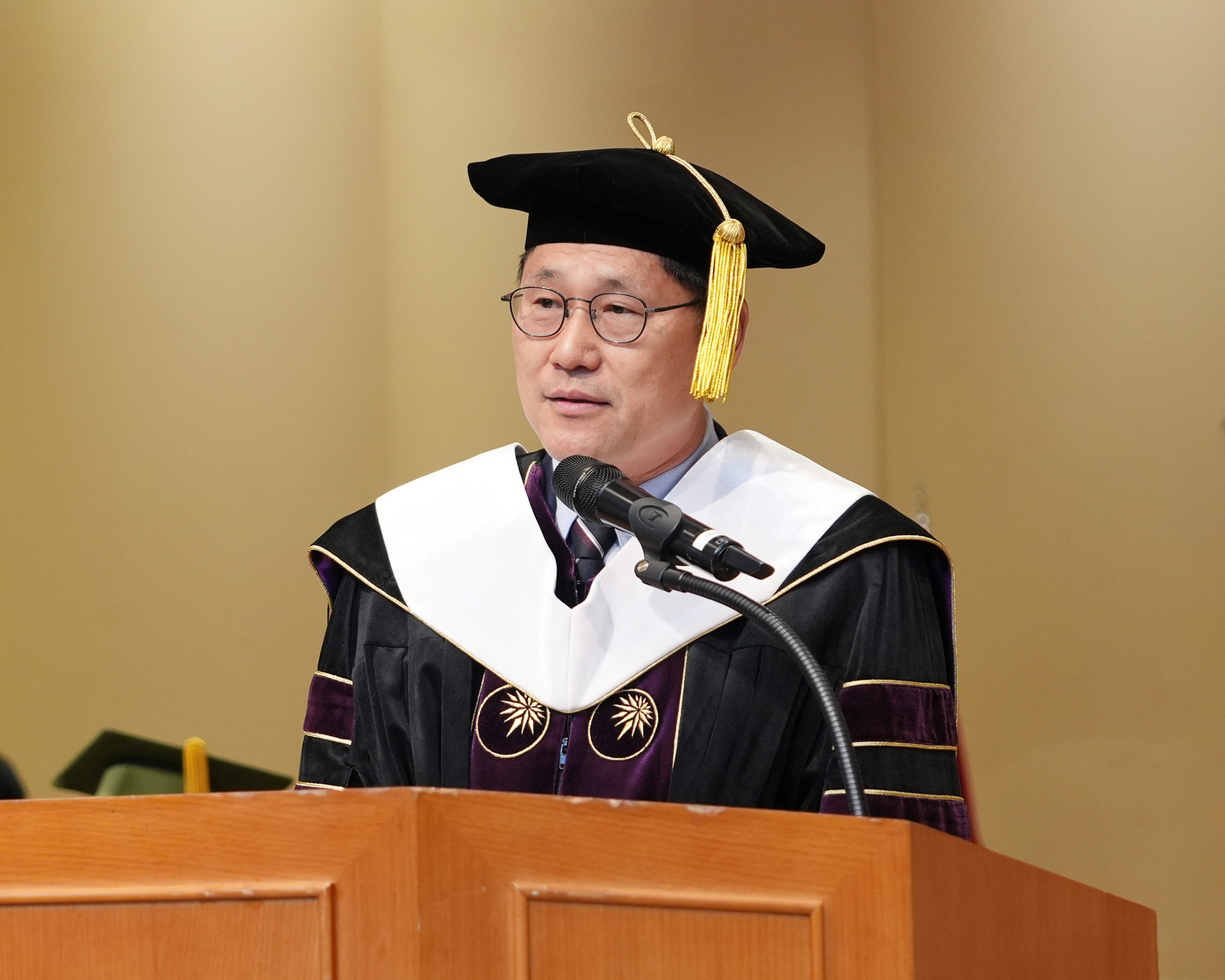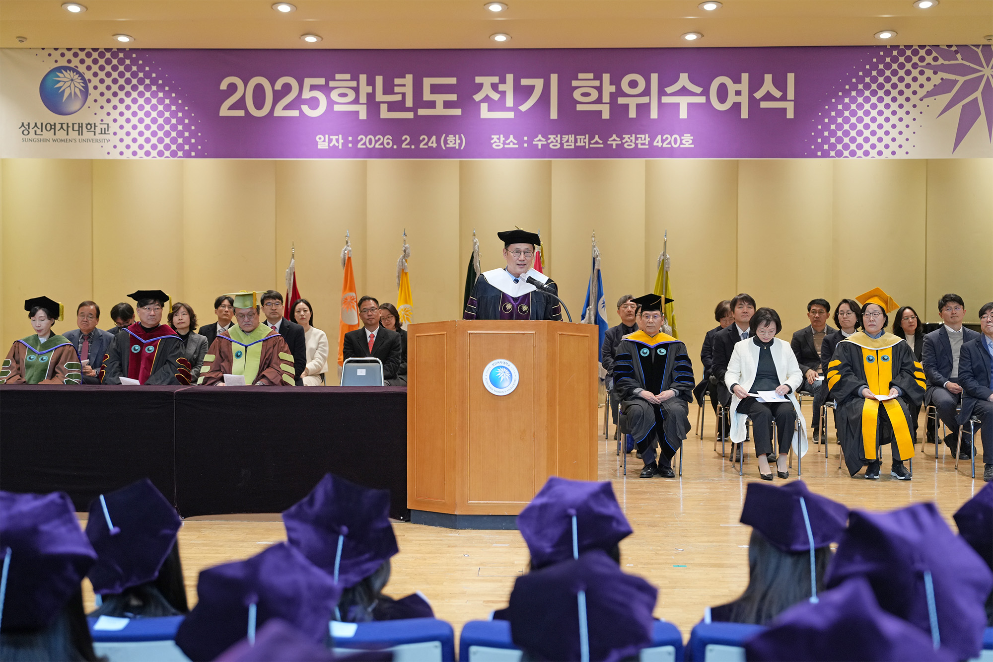 2월 24일, 성신여자대학교 수정캠퍼스에서 개최된 2025학년도 전기 학위수여식에서 이성근 총장이 졸업생들에게 축사를 전하고 있다.