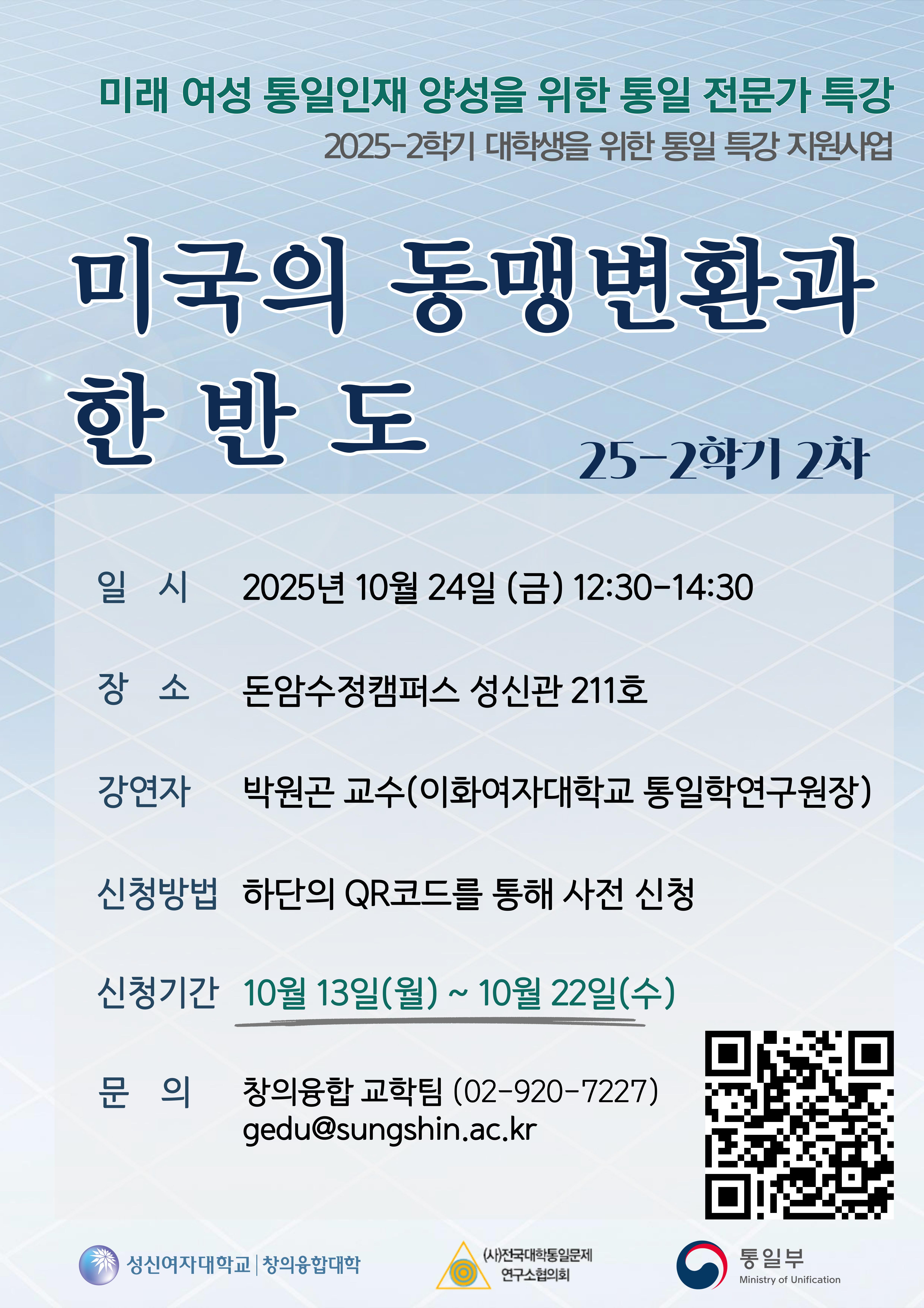 2025년 10월 24일 금요일, 창의융합대학 주관 2025-2학기 「대학생을 위한 통일 특강 지원사업」에서 박원곤 교수님을 초청하여 미래 여성 통일인재 양성을 위한 통일 전문가 특강을 개최합니다.