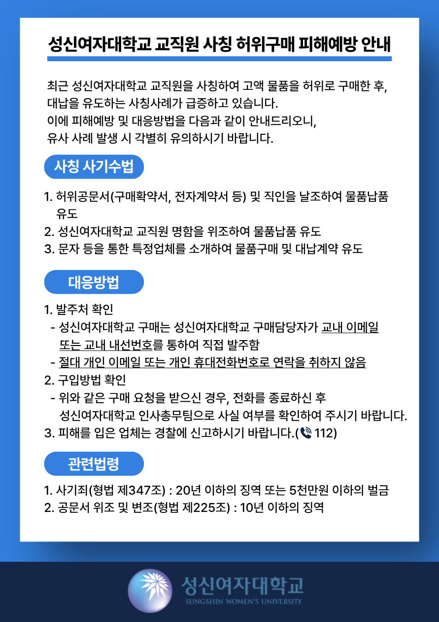 ※장학공지는 성신포탈 로그인 후 ‘공지→학부장학’에서 확인하세요. (대학원은 각 대학원 홈페이지에서 확인) fnctId=bbs,fnctNo=3182 [인사총무팀] 성신여자대학교 교직원 사칭 허위구매 피해예방 및 대응방법 안내 작성일 2026.04.15 수정일 2026.04.15 작성자 인사총무팀 조회수 374 글번호 154217 첨부파일 성신여자대학교 교직원 사칭 허위구매 피해예방 안내.png 미리보기