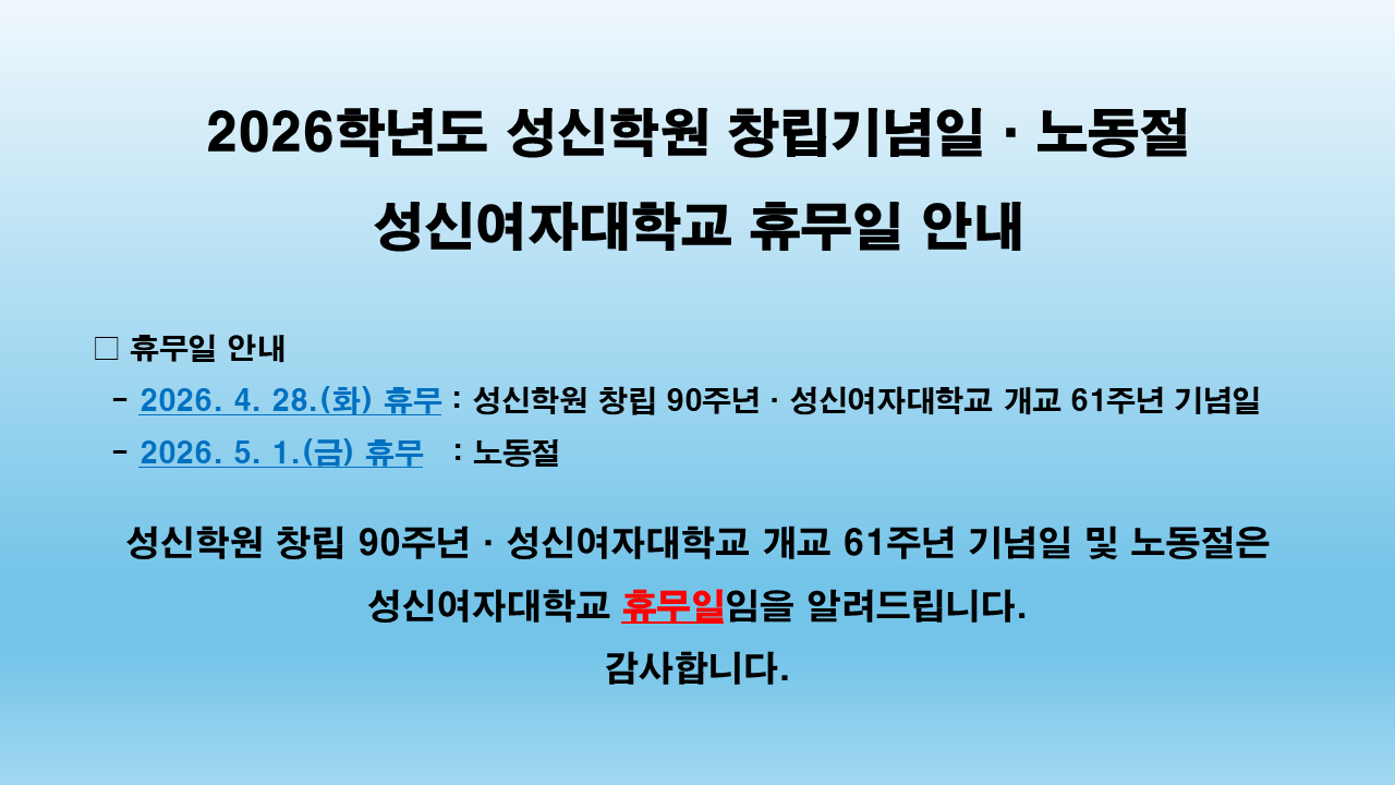 ※장학공지는 성신포탈 로그인 후 ‘공지→학부장학’에서 확인하세요. (대학원은 각 대학원 홈페이지에서 확인) fnctId=bbs,fnctNo=3182 2026학년도 성신학원 창립기념일 및 노동절 휴무 안내 작성일 2026.04.17 수정일 2026.04.17 작성자 인사총무팀 조회수 346 글번호 154306 첨부파일 첨부파일이(가) 없습니다.