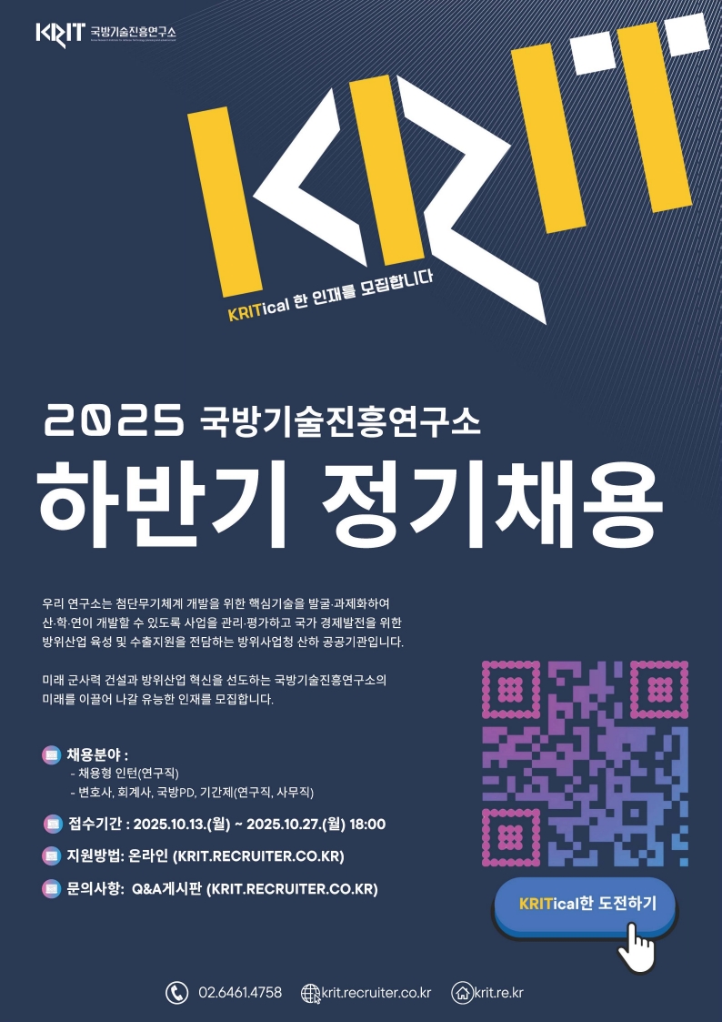 [대학일자리플러스센터] KRIT 국방기술진흥연구소 2025 하반기 정기채용 공고